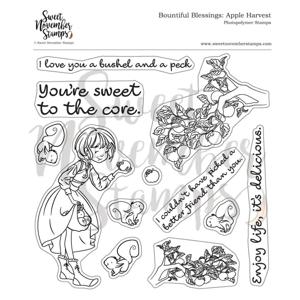 Introducing the Sweet November Stamps Apple Harvest Clear Stamp Set! This 6 x 6 inch stamp set showcases a charming lass amidst a bountiful apple harvest, accompanied by a quartet of adorable squirrels facing in all directions. Create delightful scenes with two sizes of apple tree branches, each facing both ways, and individual apples. Share your sentiments with four heartwarming messages:
