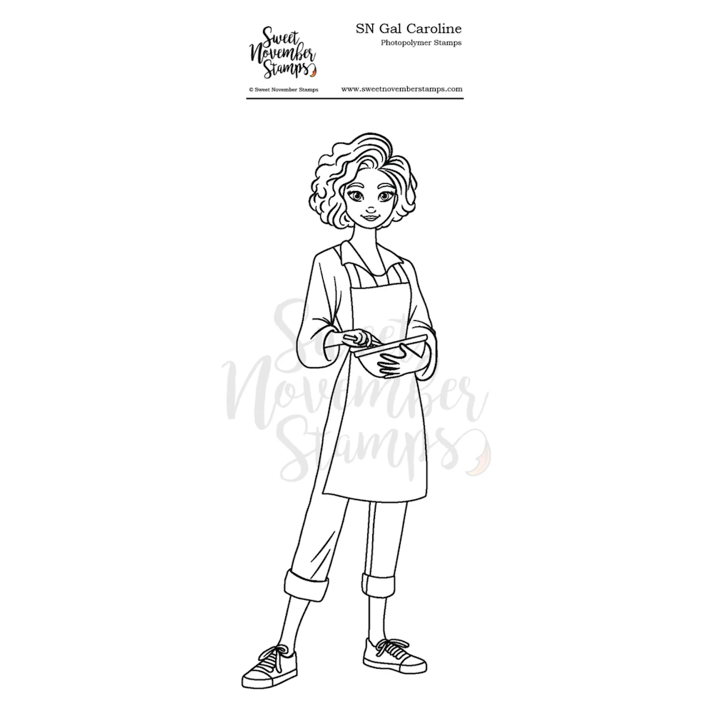The Sweet November Stamps Caroline Clear Stamp Set features SN Gal Caroline, a 5.1 inch tall baker ready to bring charm to your baking-themed projects. Perfect for adding sweetness to your cards! Made in the USA with high-quality photopolymer for crisp, precise stamping.