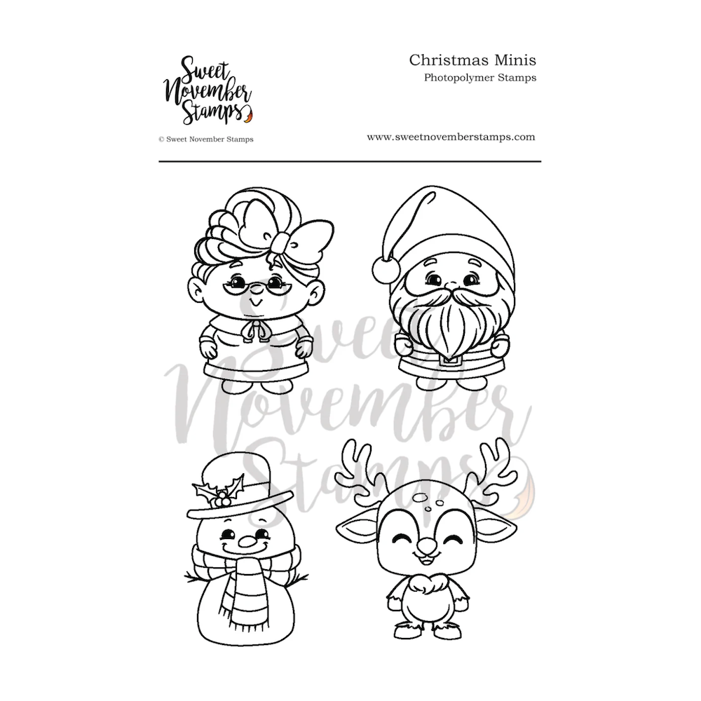 Get ready for festive fun with the Sweet November Stamps Christmas Minis Clear Stamp Set! These adorable holiday icons—Mrs. Claus, Santa, a reindeer, and a snowman—stand about 1.7 inches tall. Perfect for pairing with your favorite postage collage dies or tags to create a jolly good time in your holiday projects!