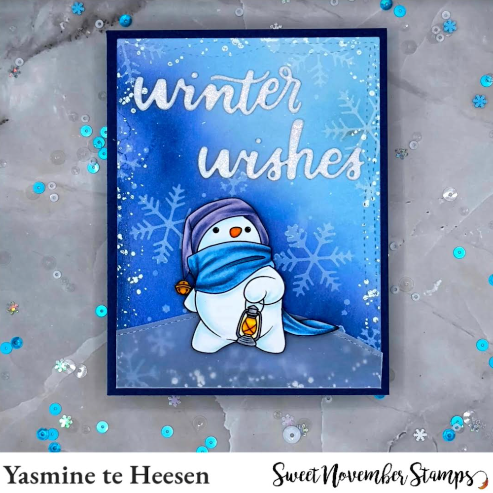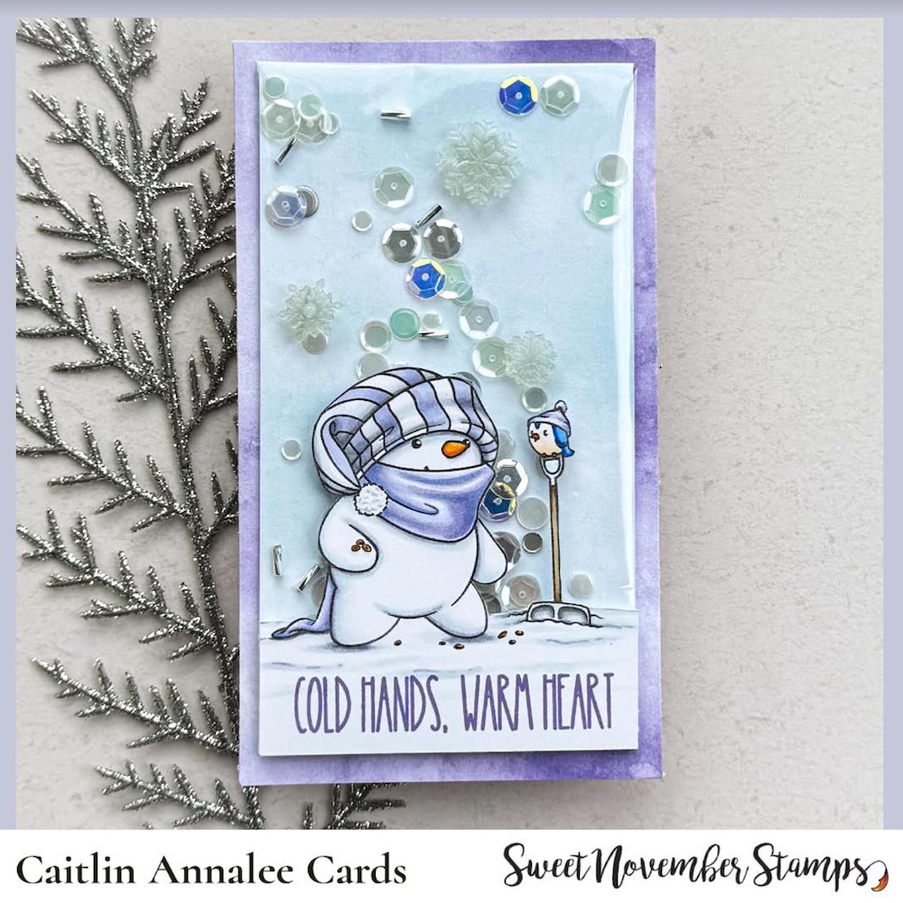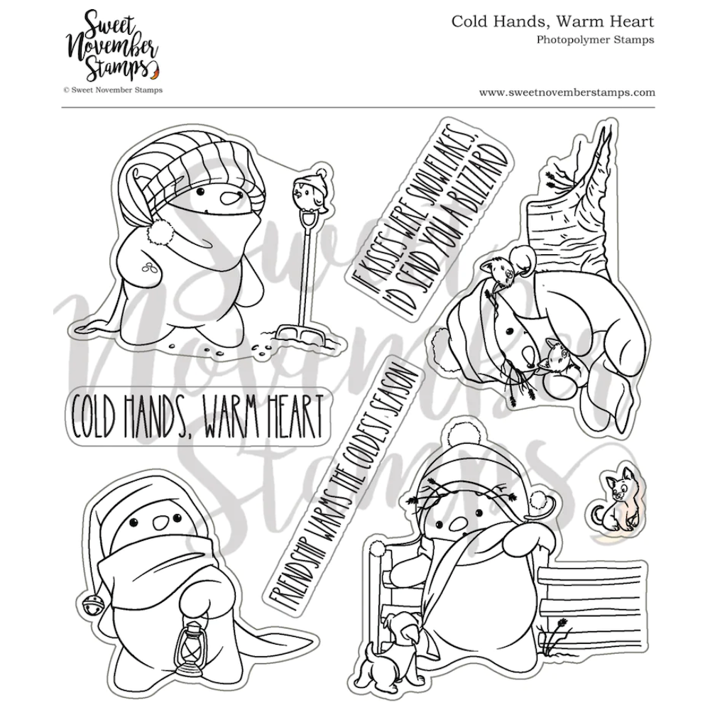 Get ready to melt hearts with the Sweet November Stamps Cold Hands Warm Hearts Clear Stamp Set. This 6 x 6 inch clear stamp set features four endearing snowmen embarking on mini adventures, from bird-feeding to kitten cuddles and playful puppy encounters under the starry night.