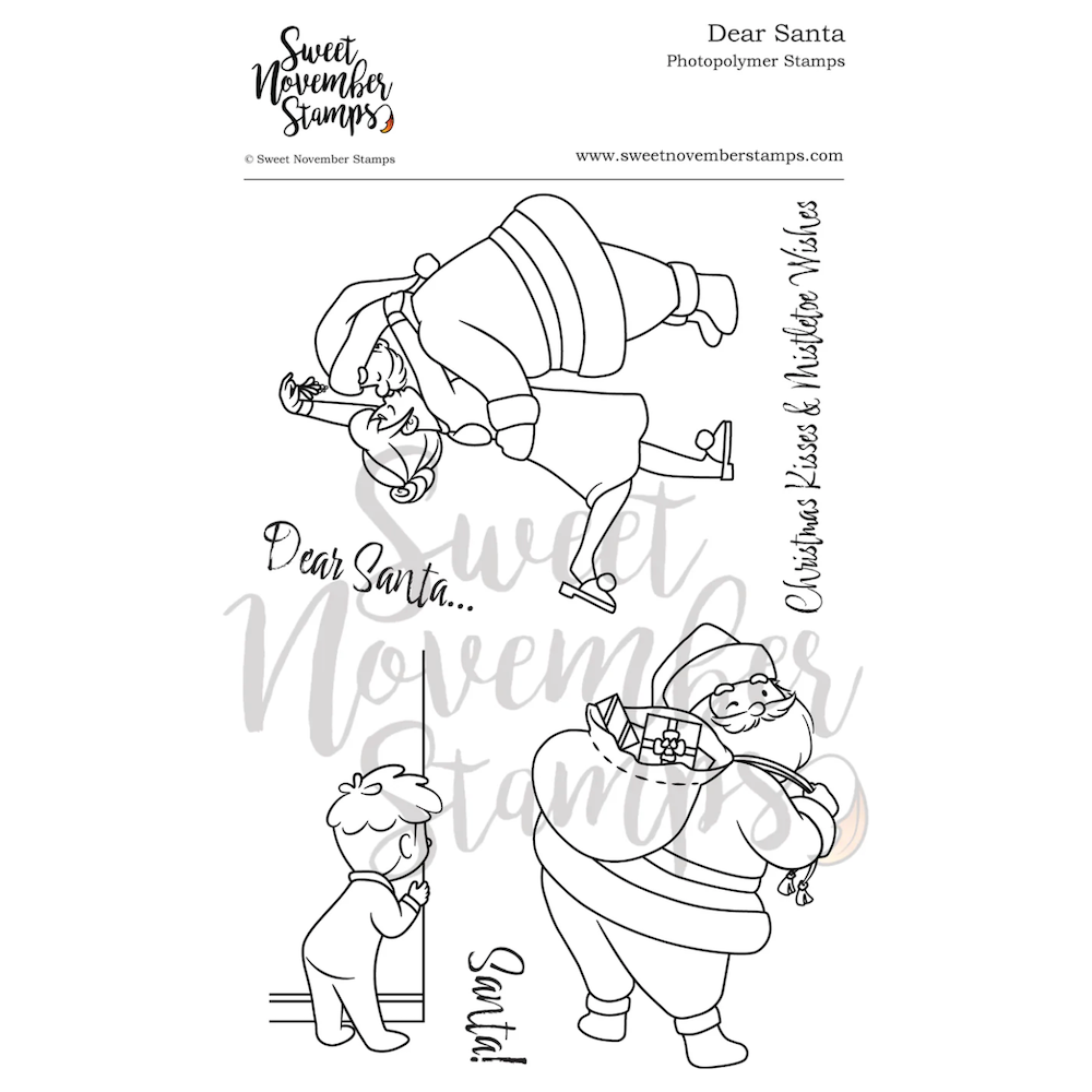 Get ready to capture Santa in the act with the Sweet November Stamps Dear Santa Clear Stamp Set! This 4x6 set features a peeking child and sweet moments of Santa kissing mommy or delivering presents, perfect for creating heartwarming holiday cards. It also includes three festive sentiments: 'Christmas Kisses & Mistletoe Wishes', 'Dear Santa...,' and 'Santa!'—adding extra cheer to your creations.
