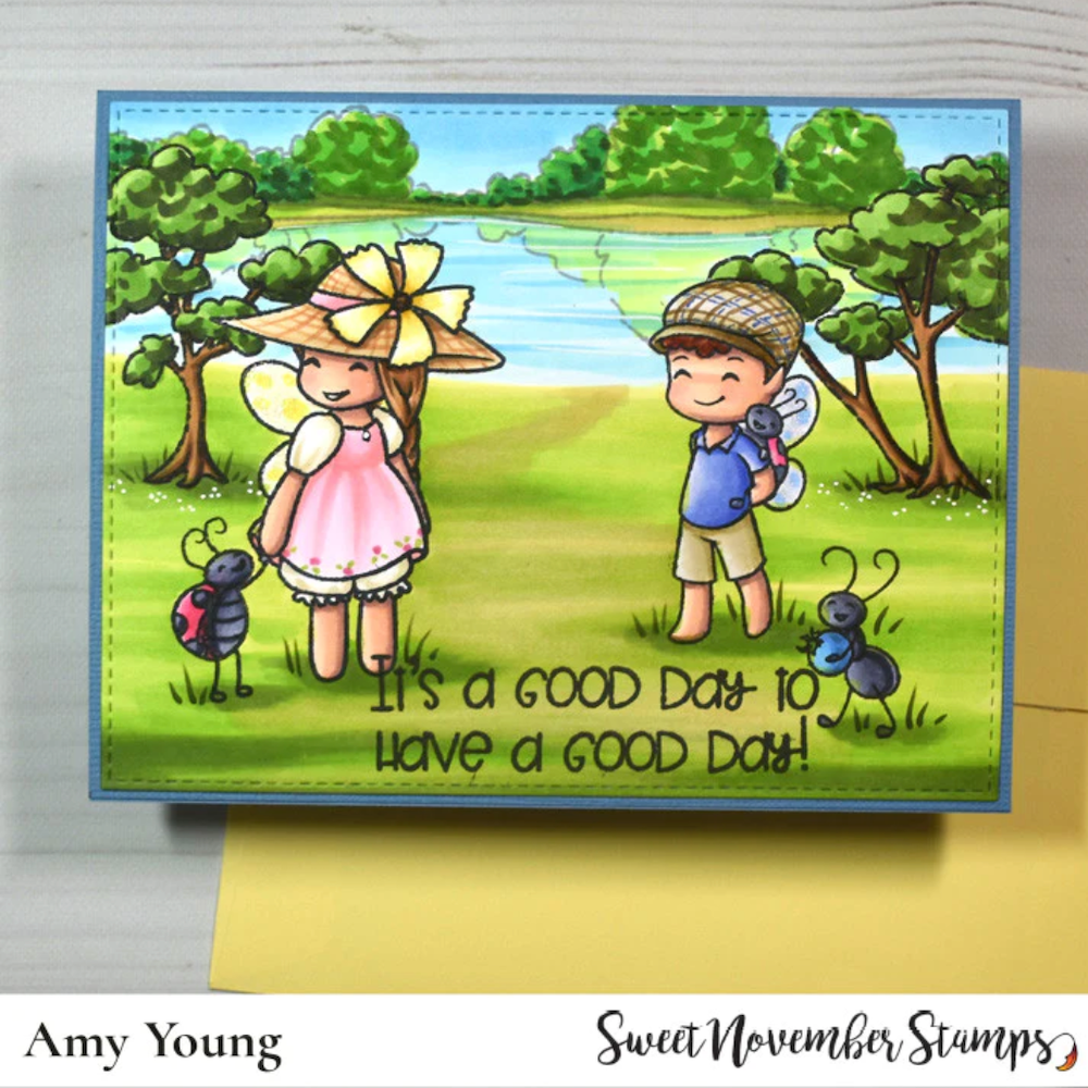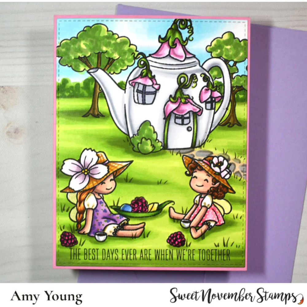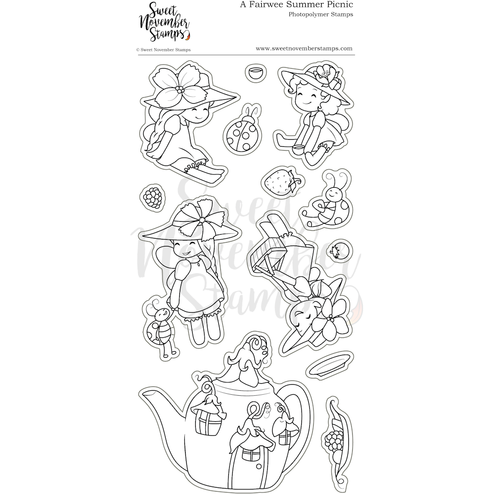 Introducing the Sweet November Stamps Fairwee Summer Picnic Clear Stamp Set. This set includes 4 main character Fairwees, a teapot house, 2 ladybugs, 3 individual fruits, a fruit platter, plate and cup to add an extra touch of whimsy! Step into a magical world where charming characters enjoy a delightful picnic with teapots filled to the brim and friendly ladybugs dotting the scene.