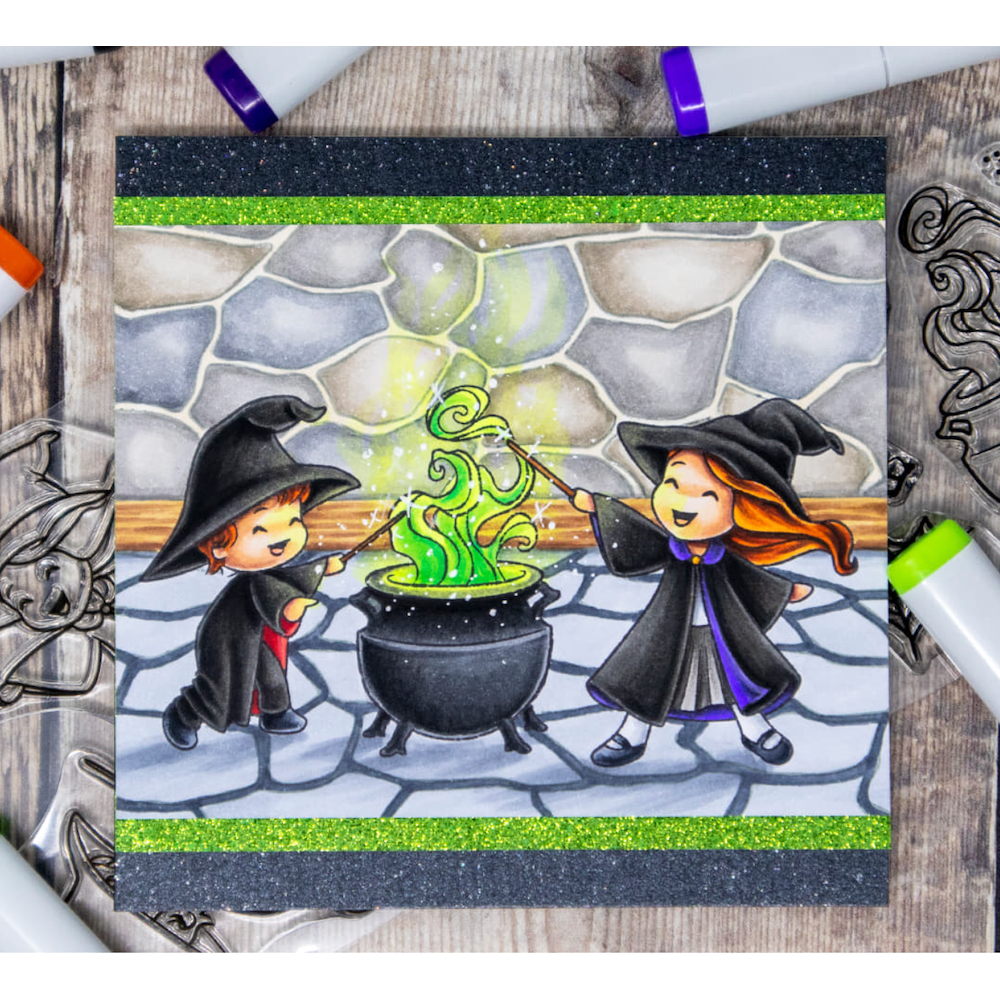 The Sweet November Stamps Halloween Room Add-on Clear Stamp Set is perfect for creating spooky Halloween scenes. This 6 x 8 background builder set includes a stone floor, stone wall, brick wall, and two eerie sentiments to set the mood: 'Spooks galore, scary witches at your door. Jack-o-lanterns smiling bright, wishing you a haunting night!' and 'Happy Halloween!' Ideal for pairing with various stamps to complete your haunted room.