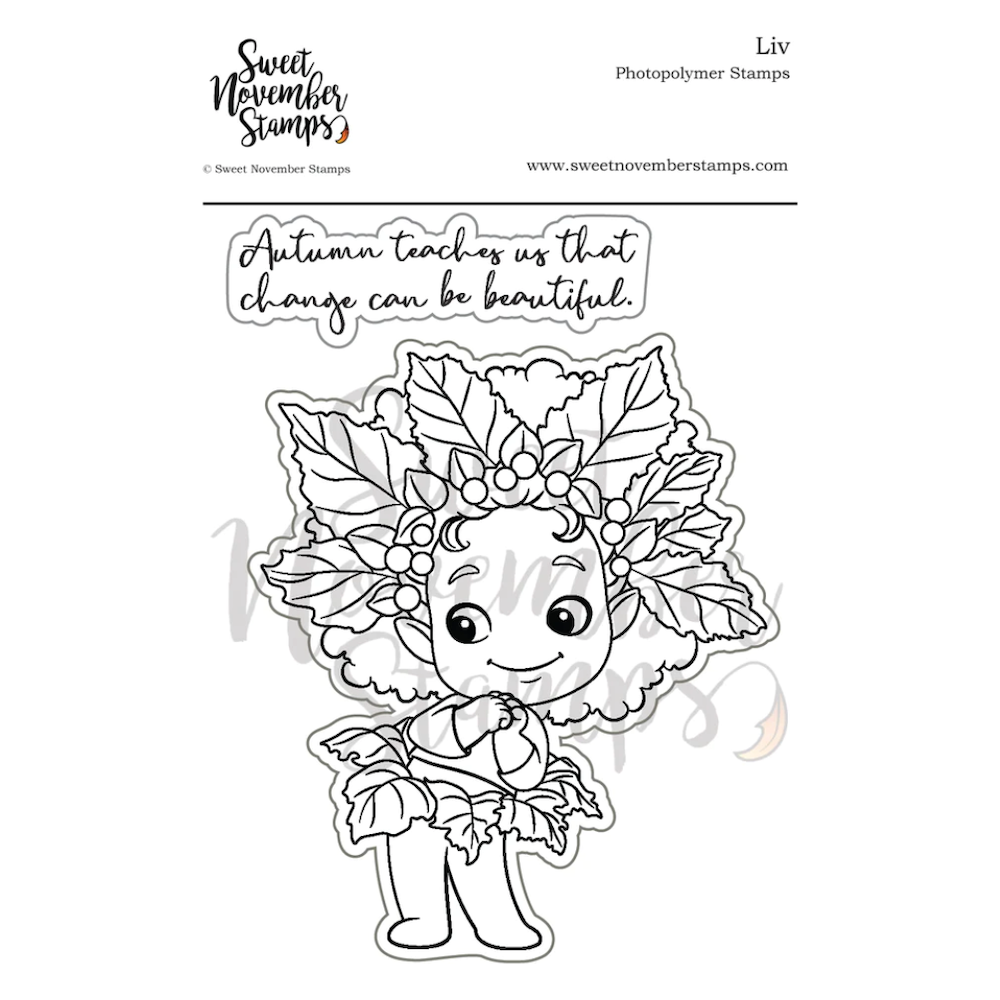 Introducing the Sweet November Stamps Nutley Clear Stamp Set! This endearing 3 x 4 inch stamp set features sweet little Liv, eagerly anticipating the arrival of Fall and the transformation of leaves. Share a meaningful sentiment with, "Autumn teaches us that change can be beautiful."
