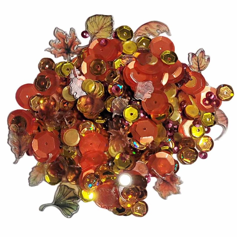 Introducing Sweet November Stamps Lovely Leaves Sequin Mixes! This exclusive blend boasts coordinated sequins in rustic yellows/gold, orangish browns, and vibrant oranges and reds. It also includes delightful SNS character elements showcasing a variety of tree leaves, ranging from 6 mm to 22 mm. These sequins are ideal for shaker cards of any size. Each packet contains approximately 1 tablespoon, and with each package being unique, add a touch of nature's beauty to your crafting projects!