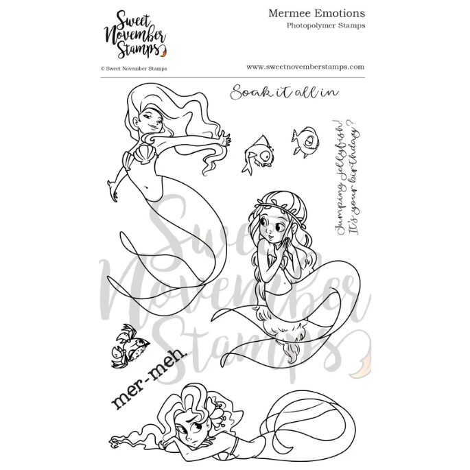 Dive into a sea of emotions with Sweet November Stamps' Mermee Emotions Clear Stamp! This 4x6 set features three unique mermaids and their aquatic companions, all unafraid to reveal their true colors. With personalized sentiments, express yourself just like the mermaids do. Sentiments include,