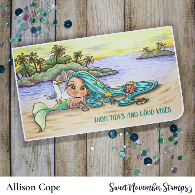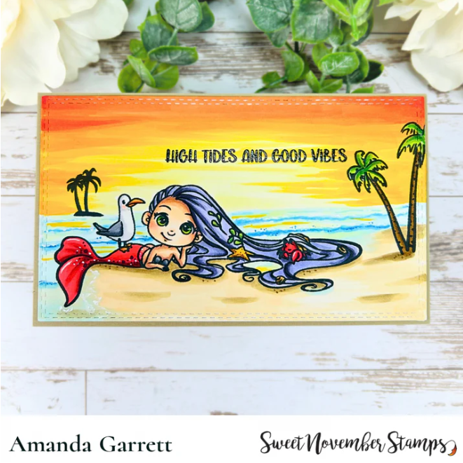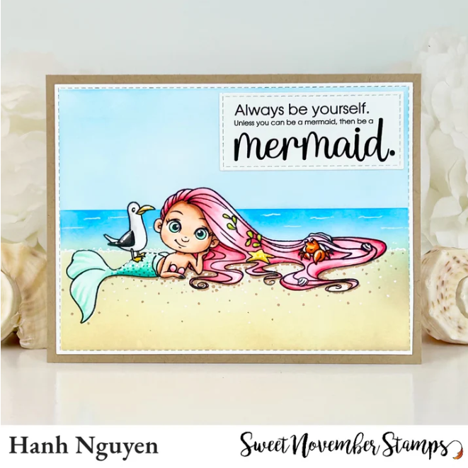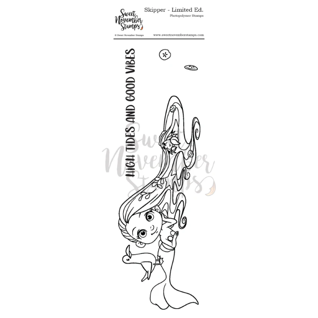 Experience the magic of mermaid Skipper with Sweet November Stamps' limited edition Skipper Clear Stamp! Previously available only as a digital image, now she's in clear stamp form, complete with sand dollars and a charming sentiment: 'High Tides and Good Vibes.' Don't miss out on this exclusive release! Once she sells out, she will not be restocked.