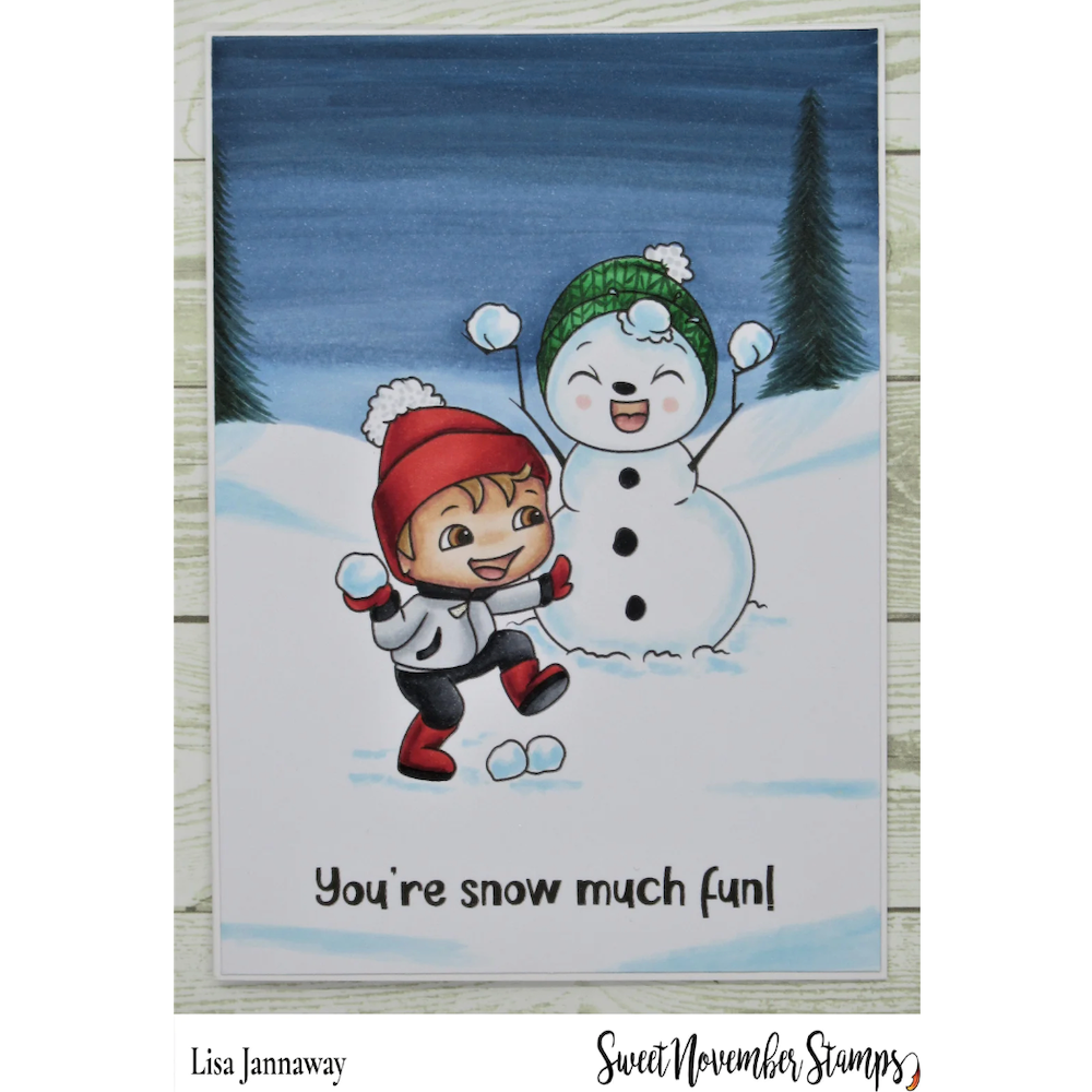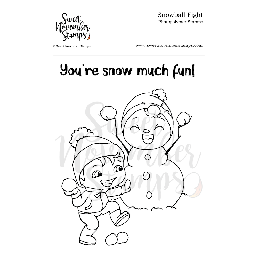Get ready for some frosty fun with the Sweet November Stamps Snowball Fight Clear Stamp Set! This petite 3x4 photopolymer stamp set features an adorable main image of a snowball fight and a sentiment that exclaims, 'You're snow much fun!' Add a playful touch to your winter-themed projects with this delightful set.