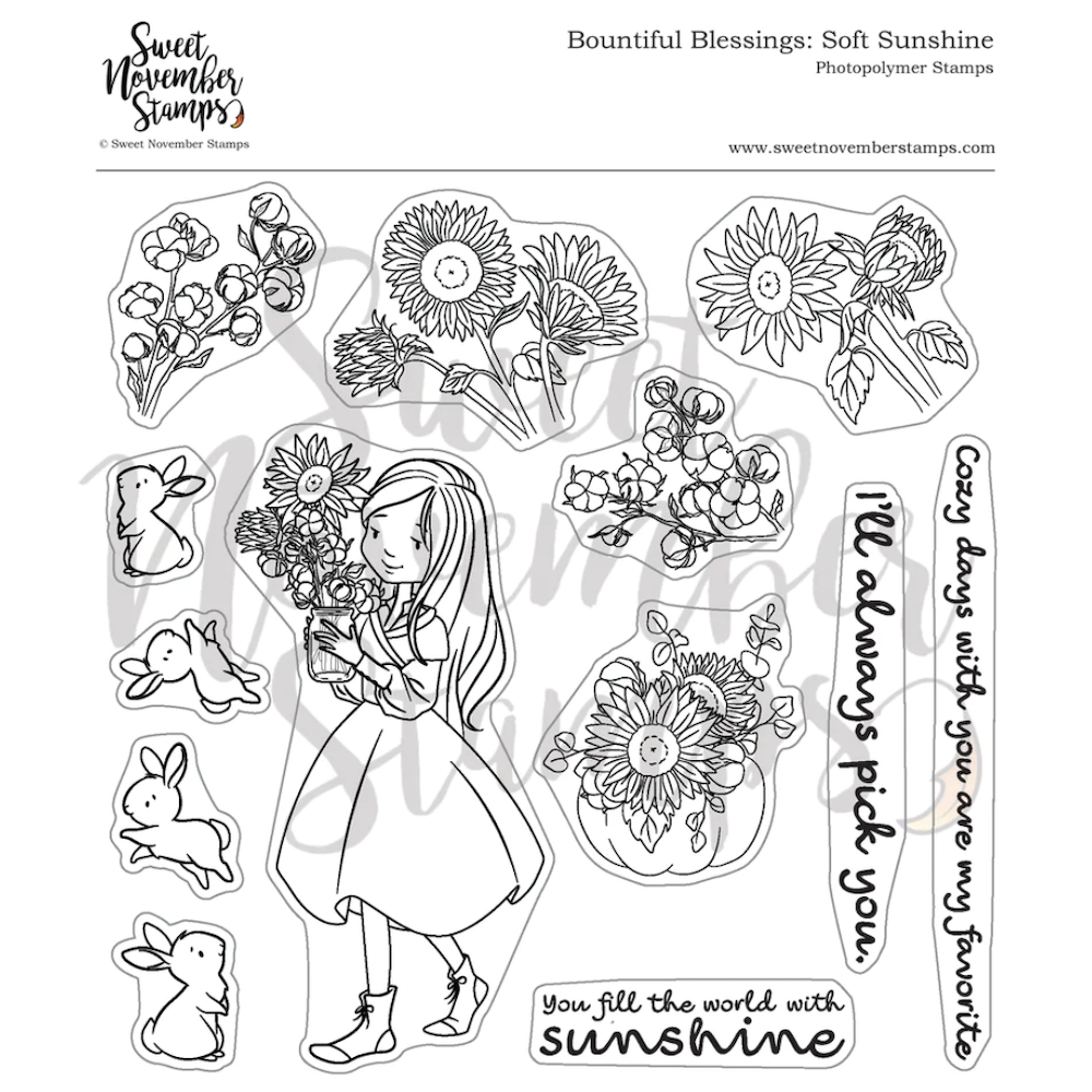 Presenting the Sweet November Stamps Soft Sunshine Clear Stamp Set! This 6 x 6 inch stamp set showcases a lovely lass with a bouquet of sunflowers and cotton, accompanied by a quartet of adorable bunnies facing in both directions. Explore two distinct sunflower images, two cotton variations, and a captivating pumpkin floral arrangement featuring sunflowers and cotton. Share your sentiments with three heartwarming messages: