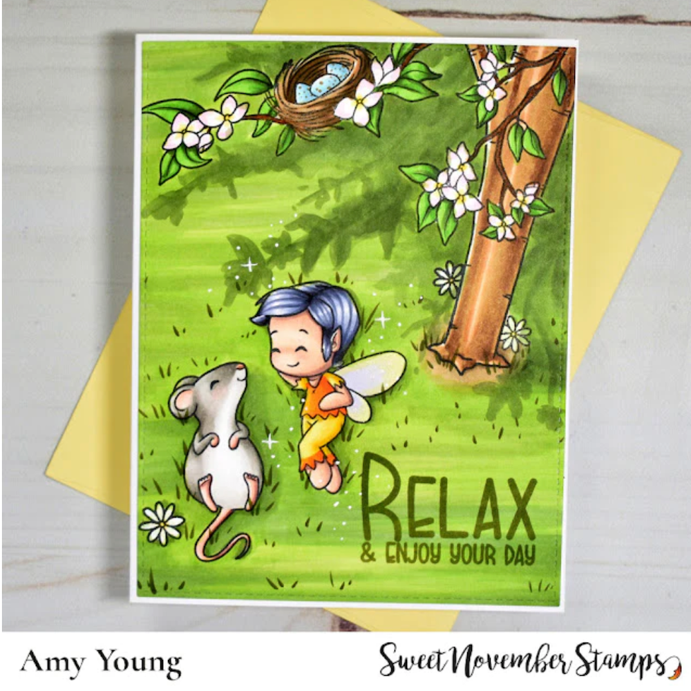Experience a fresh perspective with Sweet November Stamps Spring Wees Clear Stamp Set. This 6 x 8 inch stamp set allows you to create stunning cards and scenes from a unique vantage point. Featuring three adorable Spring Wees characters and their mouse friend, all captured from above, this set opens up a world of creative possibilities.