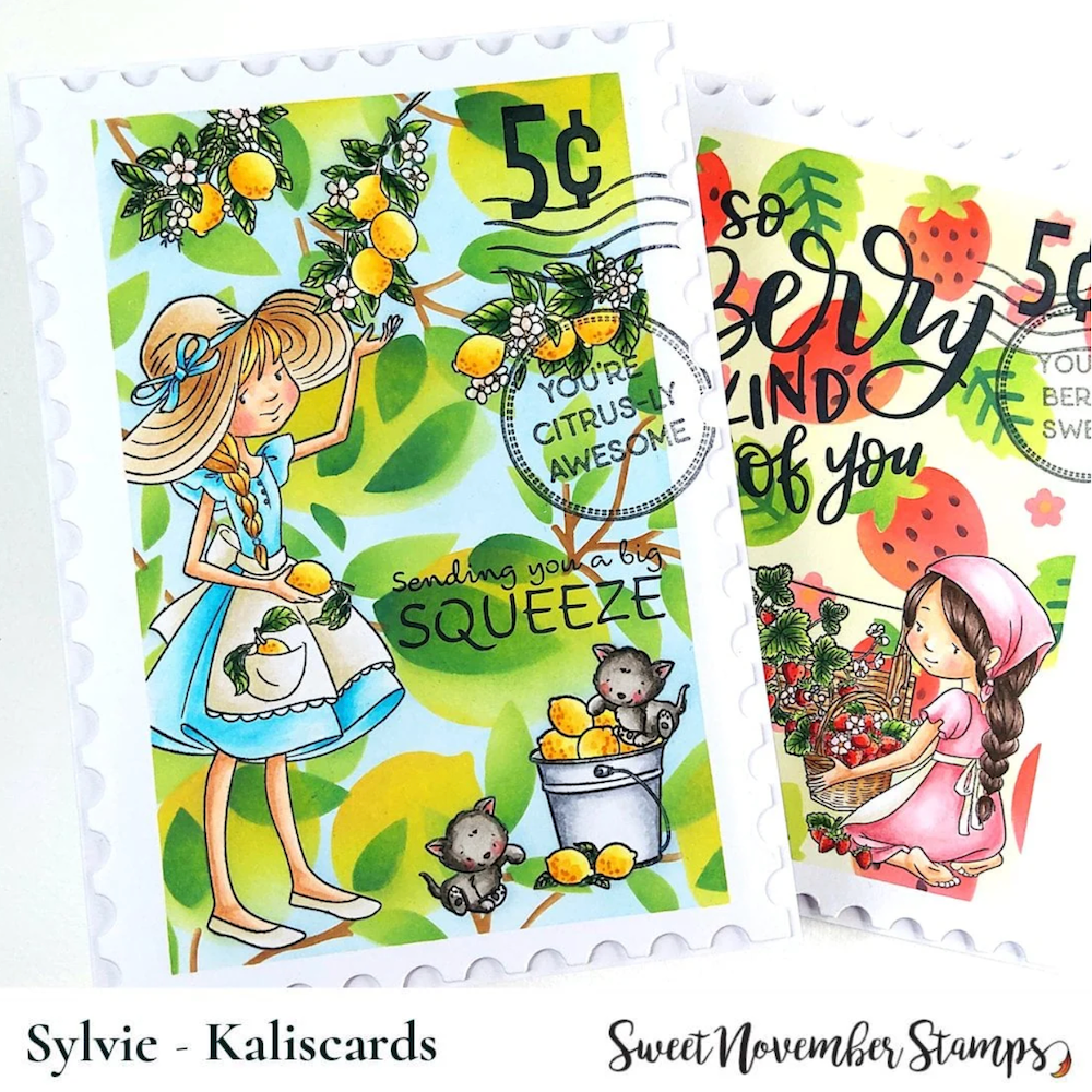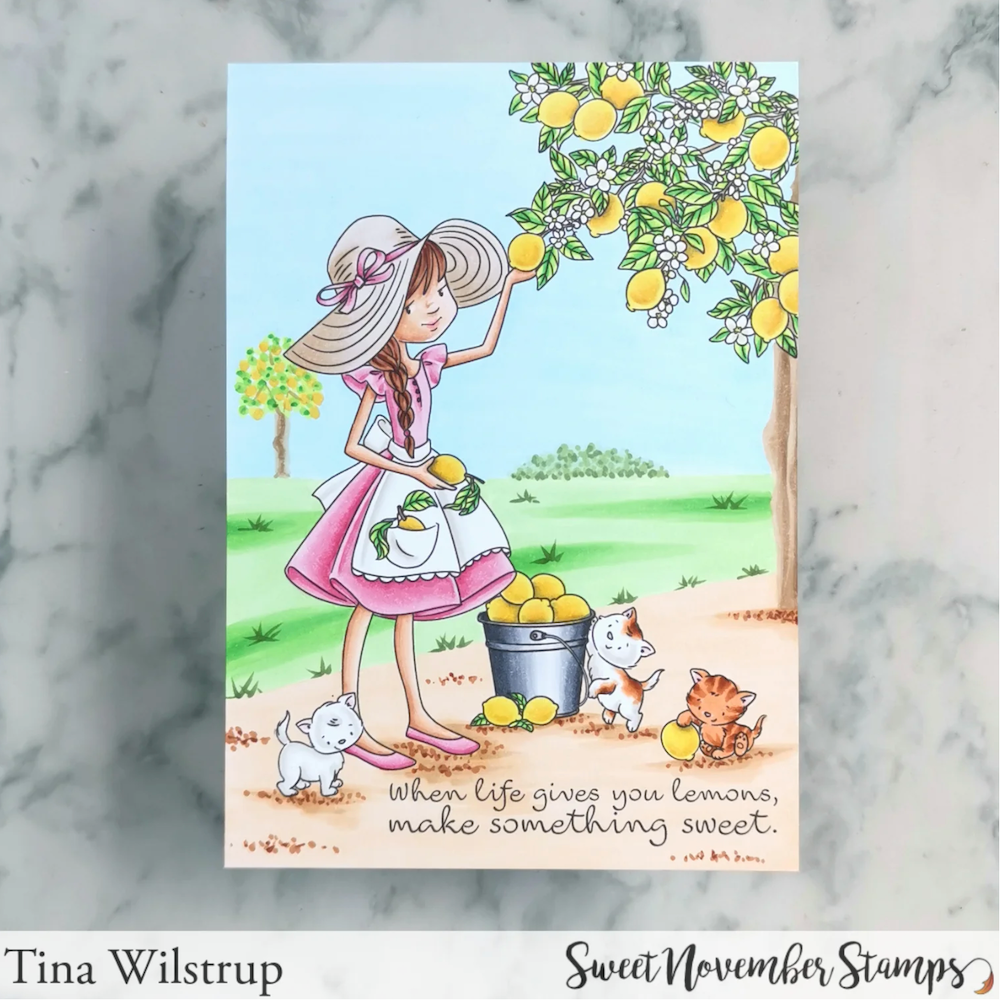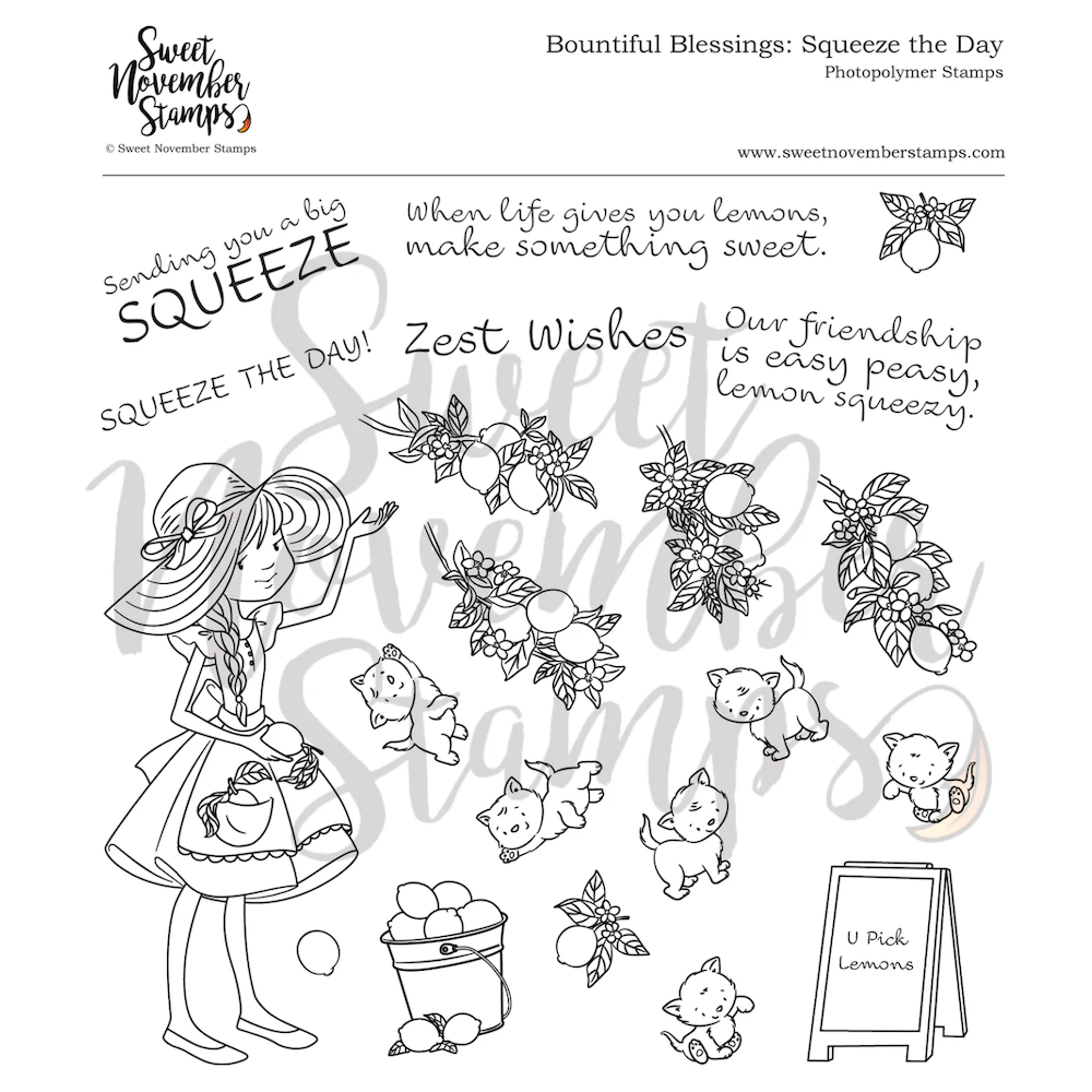 Brighten your crafts with the Sweet November Stamps Squeeze the Day Clear Stamp Set. This 6x6 set features a charming girl picking lemons, six lemon branches of various sizes, three kittens in different poses, a bucket filled with lemons, a single lemon, and a 'u pick' sign. Add a touch of zest with five unique sentiments: