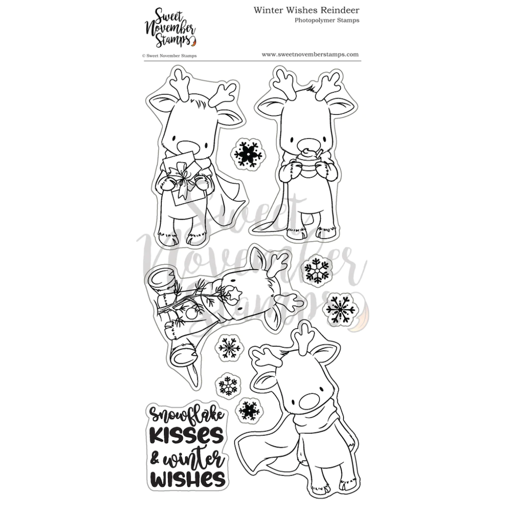Embrace the magic of the season with the Sweet November Stamps Winter Wishes Reindeer Clear Stamp Set. Measuring 4 x 8 clear inches, this clear stamp set features four adorable and fuzzy reindeer ready to spread holiday cheer. Watch as they bring gifts, enjoy cocoa, decorate the tree, and drop by for visits in your winter card creations.