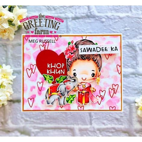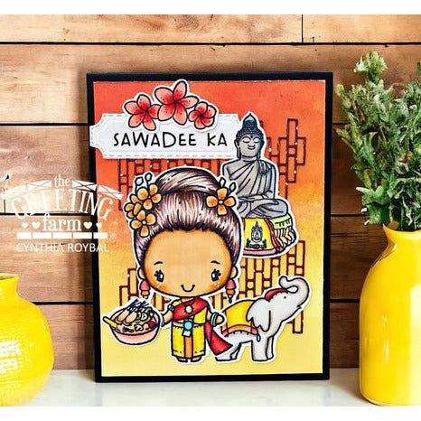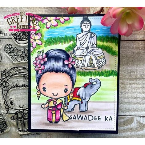 Embark on a journey with Anya from The Greeting Farm with this beautiful 9-piece clear stamp set. Featuring authentic Thai elements such as floral designs, traditional food, an elephant and a Buddha statue, along with two native greetings, this set is perfect for adding a touch of culture to your crafts. Sentiments include: