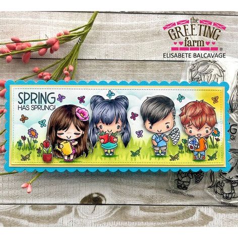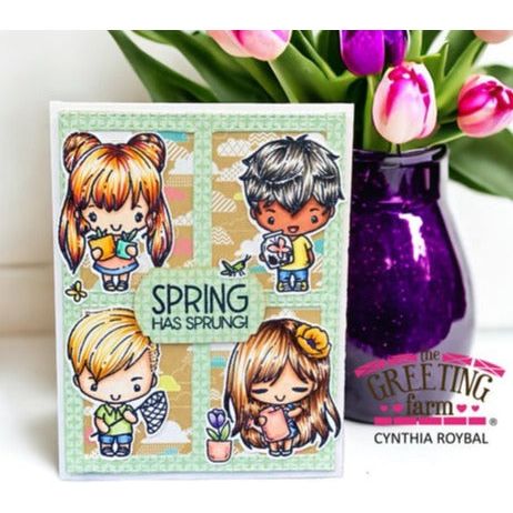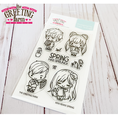 Experience the joys of spring with The Greeting Farm Mini-Remix Spring Clear Stamps. This set includes 9 charming stamps contained in a 4x6 inch clear set, featuring children in different spring activities. From catching butterflies to watering plants, these stamps will add a touch of whimsy to your projects. Get yours now and embrace the season of rebirth. Sentiment included: Spring has Sprung!
