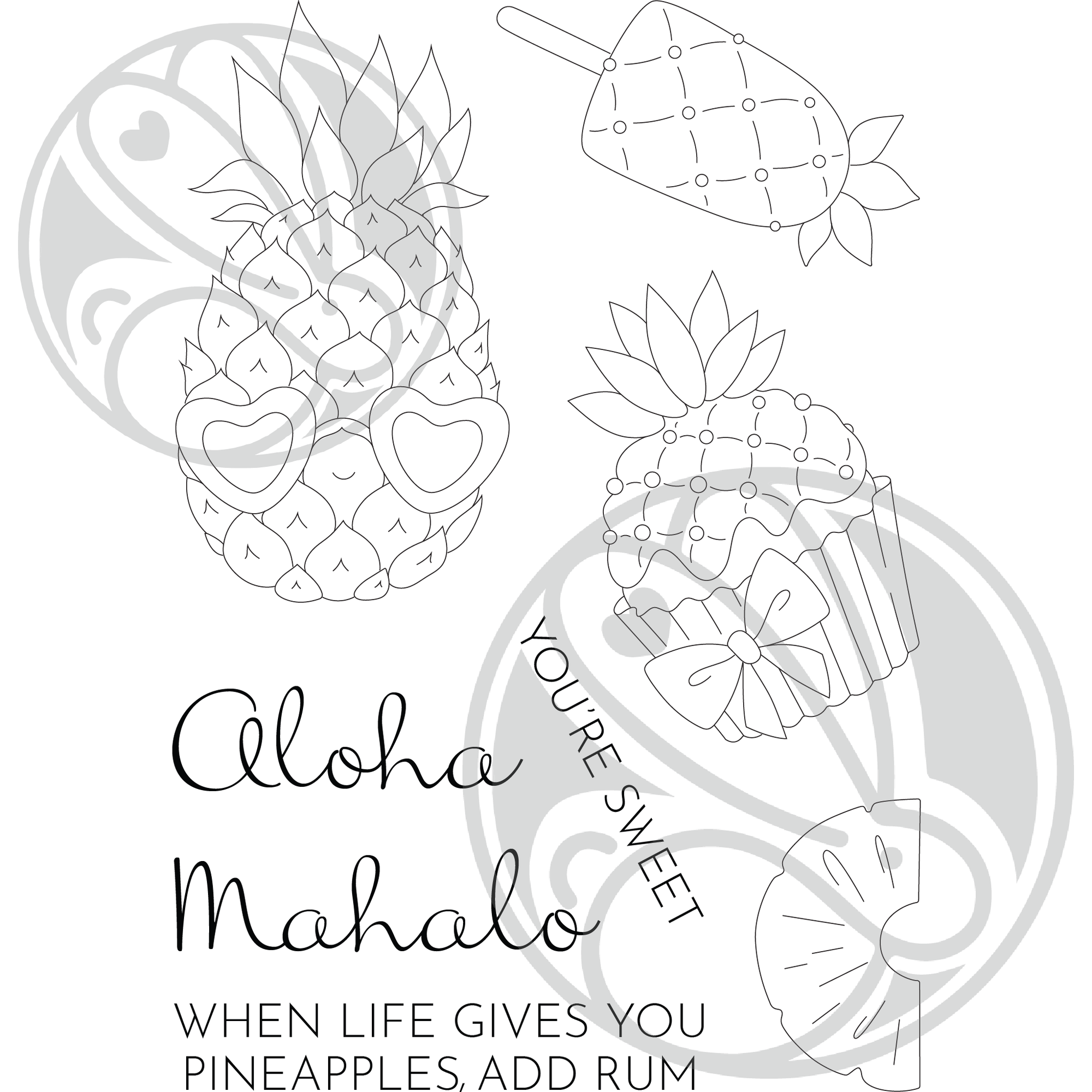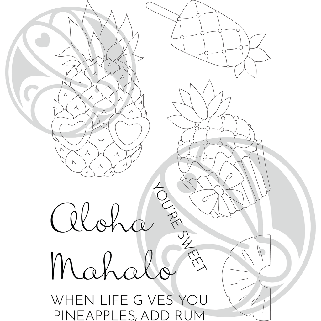 Introducing the Aloha - Pineapple Clear Stamps by The Rabbit Hole Designs! This pineapple-themed set is packed with tropical charm. Included in this 4x6-inch clear stamp set are rather stylish pineapple-wearing sunglasses, a pineapple-themed cupcake, a pineapple popsicle, and a juicy pineapple slice. To add an extra touch of Hawaiian flair, the set features two big, bold scripty words: Aloha and Mahalo. Along with these scripty words, you'll find builder sentiments to complete your designs with personalized messages. For added convenience, coordinating dies are also available, allowing you to effortlessly create dimensional and detailed projects. Get ready to embrace the aloha spirit with this delightful stamp set!