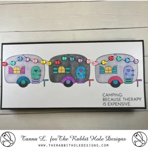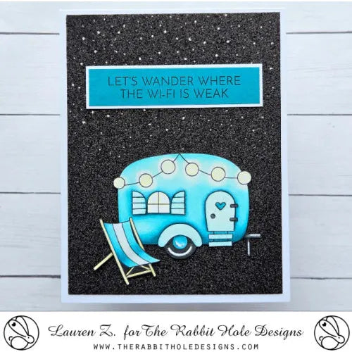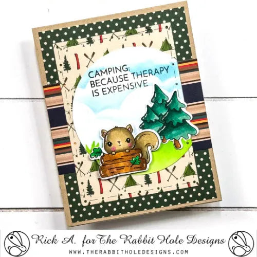 The Rabbit Hole Designs Glamping with Tailette Clear Stamp and Die Set: This set includes the Glamping with Tailette Clear Stamps and coordinating dies. The stamp set features a cute squirrel gathering wood for the fire, a pop-up camper decorated with fun lights, a stump and chair to sit on, and pine trees to set the scene. Additionally, it includes three fun sentiments. The deeply etched, clear photopolymer stamps ensure precise placement. The dies are made from 100% premium steel and are compatible with most die-cutting machines. Illustrated exclusively by Agota Pop for The Rabbit Hole Designs. Made in the USA. Stamp is 4x6 inches.