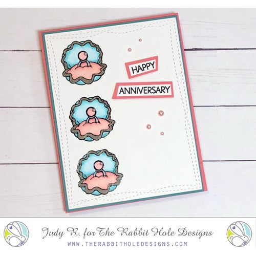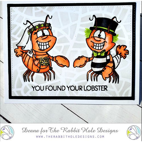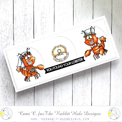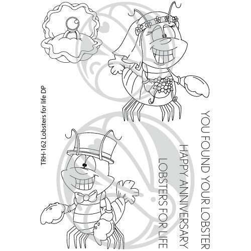 This is a 4x6 inch stamp set illustrated exclusively by Dustin Pike. Features a bride and groom lobster along with a pearl ring sitting in an open clam shell. Fun sentiments round out this stamp set, which should be a hit for all those summer themed weddings.