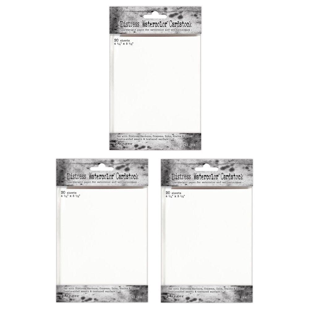 Tim Holtz Distress Watercolor Cardstock is an ideal surface to use with Distress Markers and other water-reactive products in the Tim Holtz Distress product line. Distress Watercolor Cardstock is pre-cut to 4.25 x 5.5 inch sheets, perfect for card-making projects. The durable 118 lb. cardstock has a smooth side for detailed stamping and coloring and a textured side for creative blending. Use this cardstock for most techniques involving water as it resists buckling and dries quickly. Packaged in 20 pre-cut sheets, this bundle includes 3 packs of TDA39549 Distress Watercolor Cardstock for a total of 60 sheets.