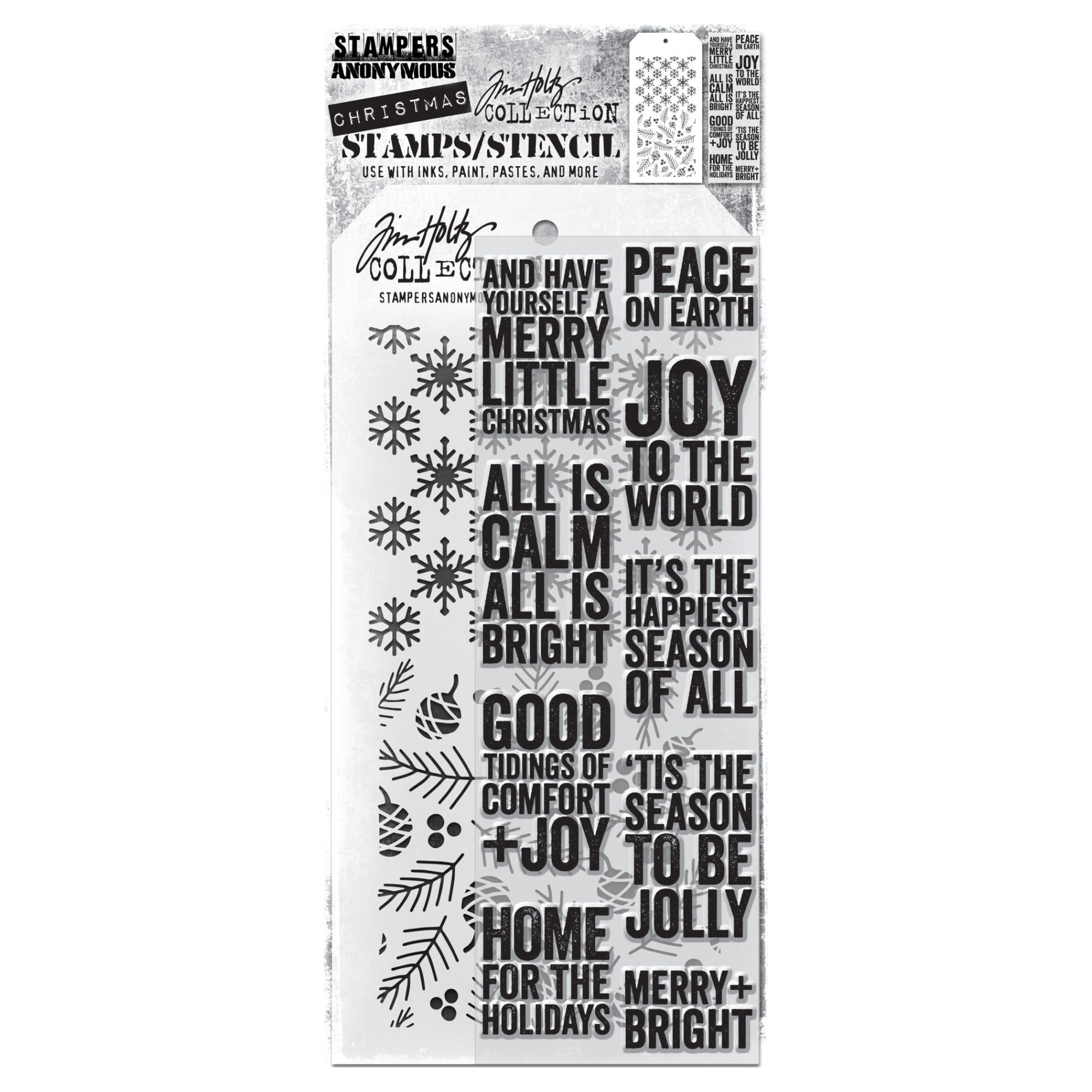 Tim Holtz Mixed Media Set includes clear stamps and a custom layering stencil designed to add texture and imagery to your creativity. Use with your favorite inks, paints, sprays, and pastes for endless mixed media possibilities.