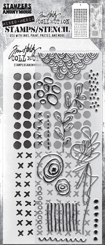 Tim Holtz Clear Stamps mixed media set includes clear stamps & a custom layering stencil designed to add texture & imagery to your creativity. Use with your favorite inks, paints, sprays, and pastes.