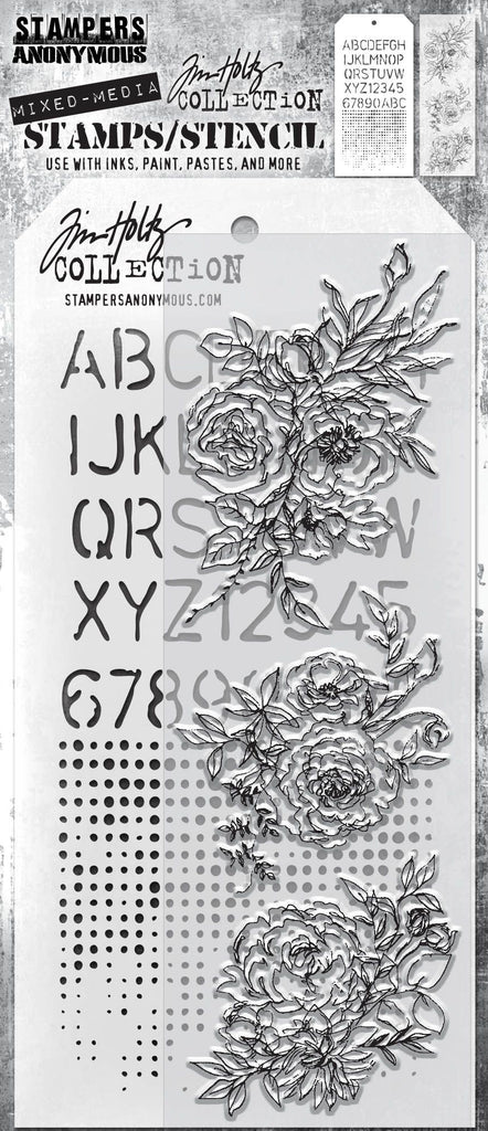 Tim Holtz Mixed Media Set includes clear stamps and a custom layering stencil designed to add texture and imagery to your creativity. Use with your favorite inks, paints, sprays, and pastes for endless mixed media possibilities.