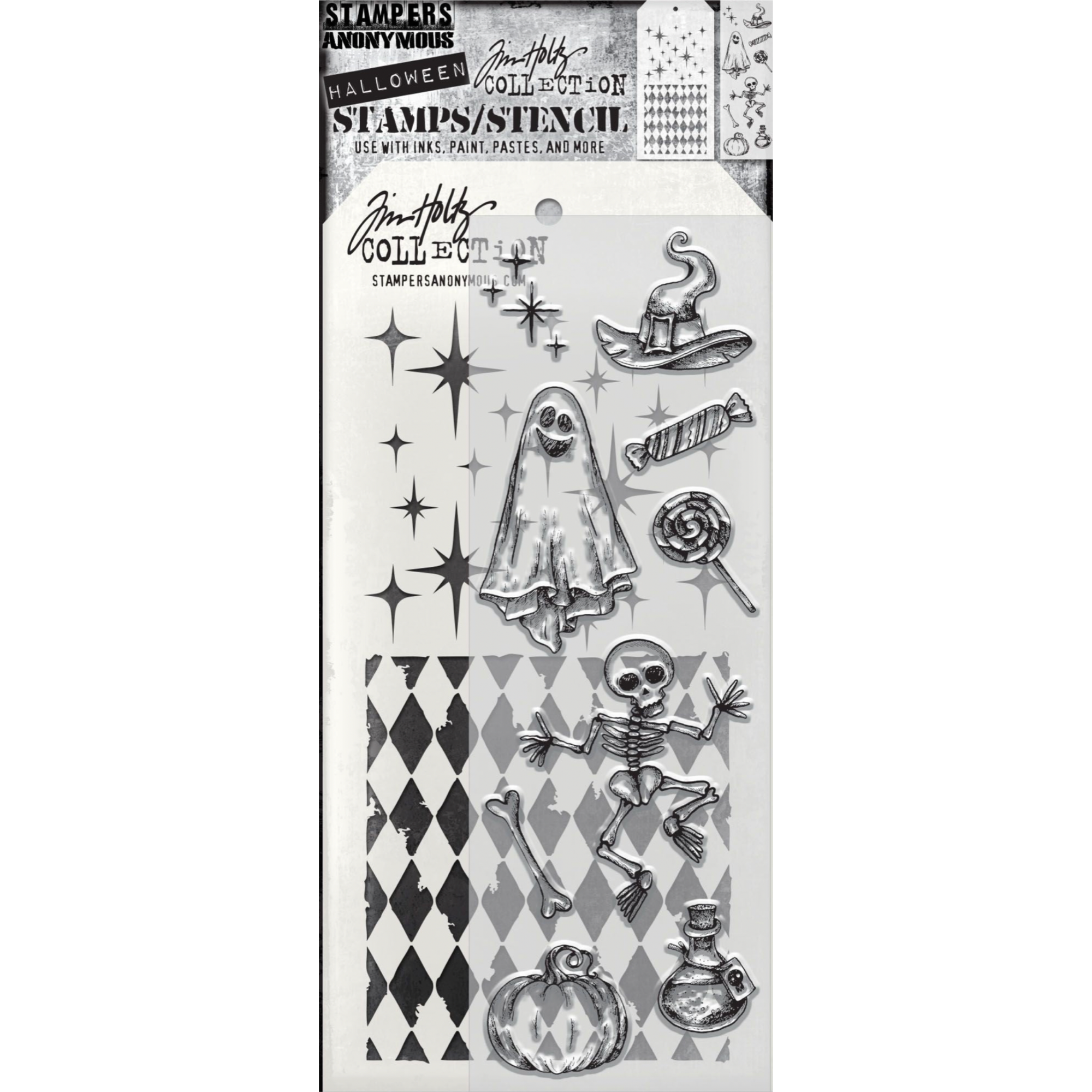Tim Holtz Mixed Media Set includes clear stamps and a custom layering stencil designed to add texture and imagery to your creativity. Use with your favorite inks, paints, sprays, and pastes for endless mixed media possibilities.