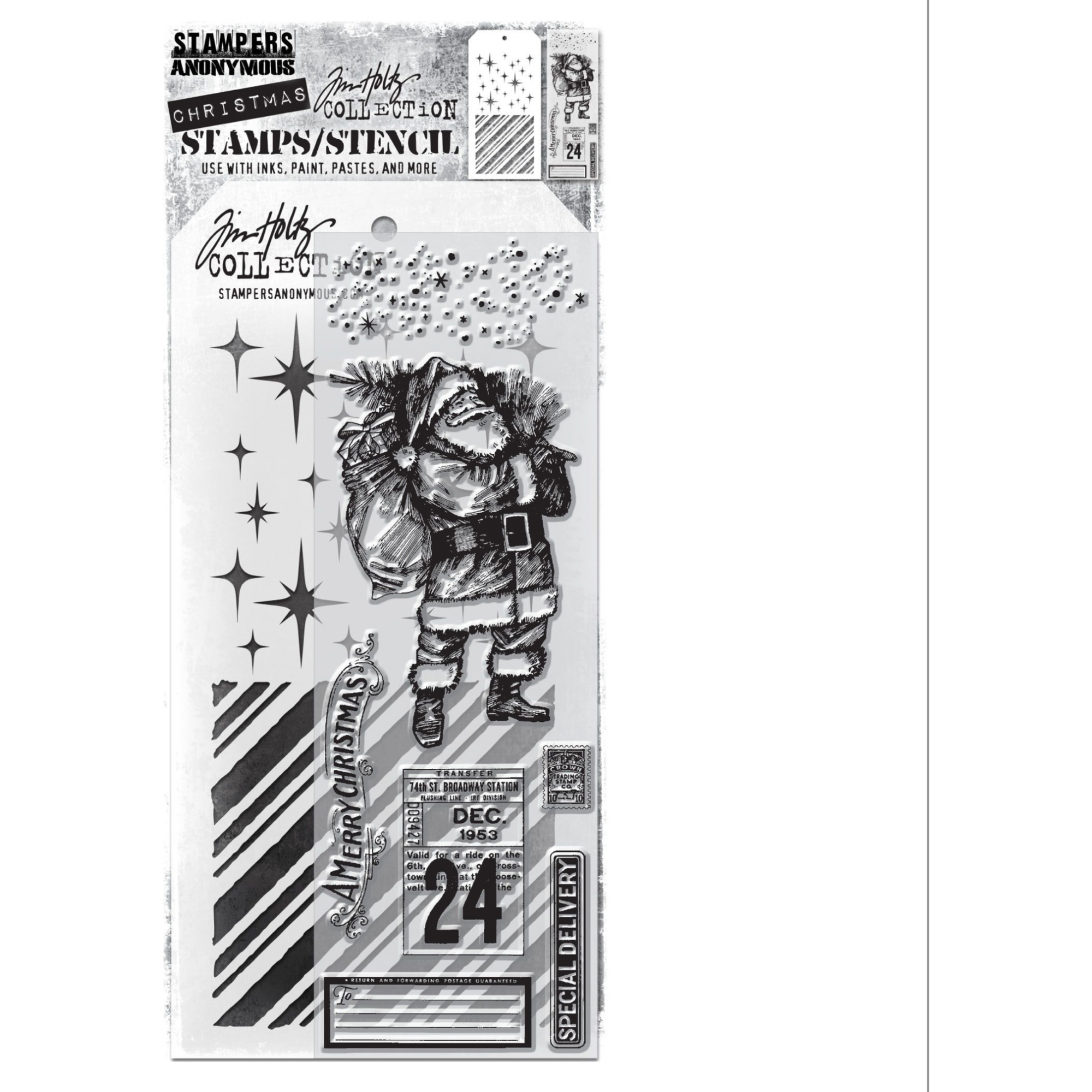 This Tim Holtz Clear Stamps and Stencil mixed media set includes clear stamps and a custom layering stencil designed to add texture and imagery to your creativity. Use with your favorite inks, paints, sprays, and pastes. This stamp set features images curated by Tim Holtz from the Cling Rubber Stamps Vintage Holiday cms423. Additionally, it includes smaller versions of the Tim Holtz Layering Stencil Sparkle ths132 and Tim Holtz Layering Stencil Peppermint ths095, which are sold separately in their full size, but come together in this fun smaller set. Stamp Size: 3.0 x 8.0 inches, Stencil Size: 8.5 x 4.25 inches.