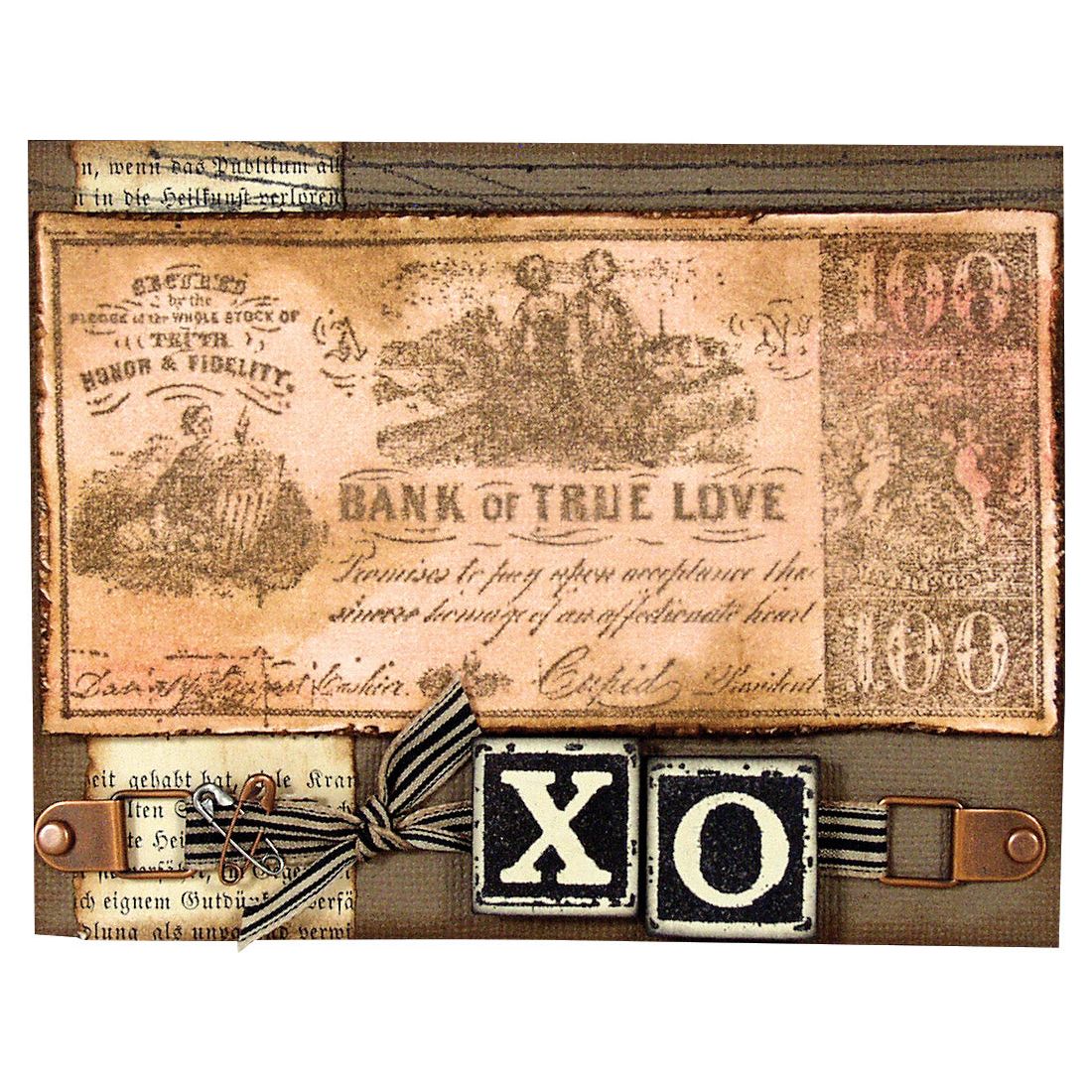 The stamp features a detailed vintage distressed collage of Bank notes from the bank of love, money, newsprint, an X O as well as other decorative elements. It measures approximately 2.5 x 3.5 inches.