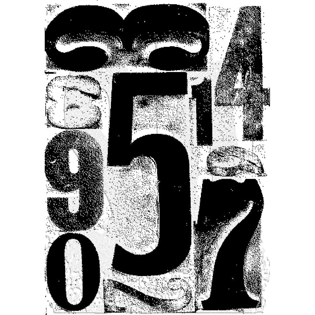 The stamp features a detailed vintage distressed collage, large numbers in different fonts. It measures approximately 2.5 x 3.5 inches.