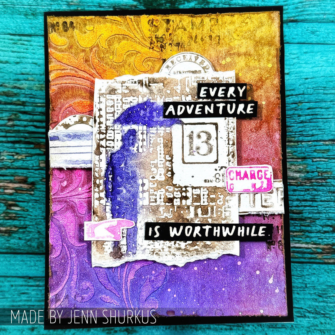 The stamp features a detailed vintage collage with a silhouette of a man holding an umbrella, a powerline with birds perched upon it, a number 13 card, and other fun elements. It measures approximately 2.5 x 3.5 inches.