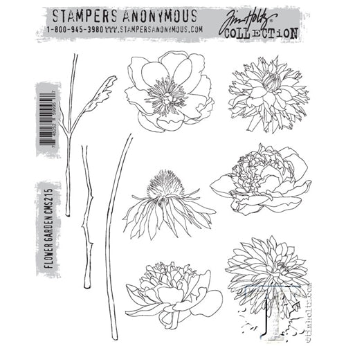 Tim Holtz Cling Rubber Stamps Flower Garden set includes nine deeply etched red rubber cling mount stamps that adhere to any clear acrylic block, sold separately. With Images curated by Tim Holtz, this set features 6 different blooming flowers, and three stems to create your own bouquet. The full stamp sheet measures 7.0 x 8.5 inches.