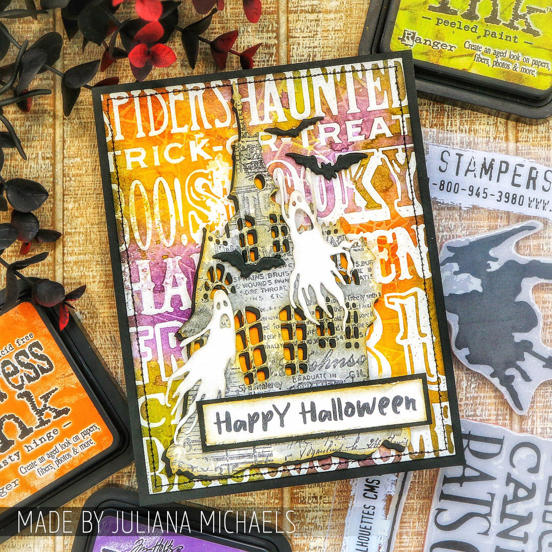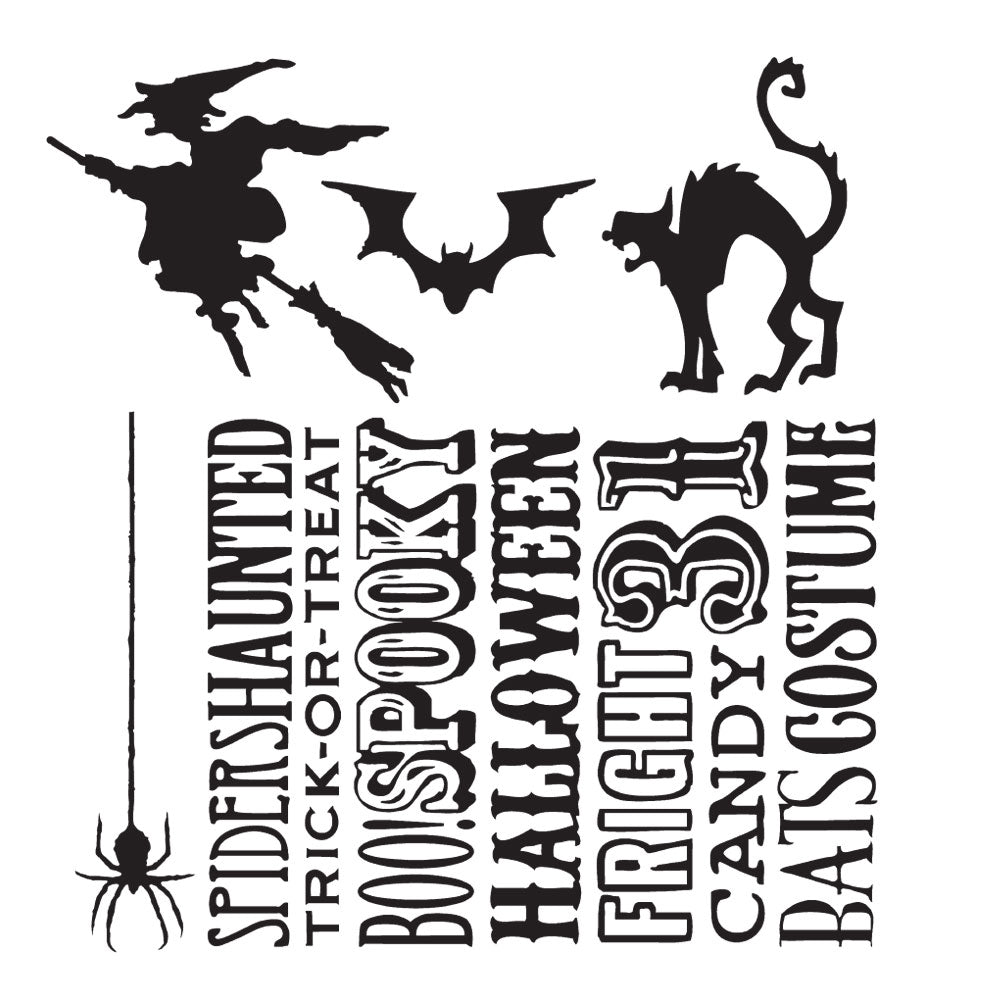 Tim Holtz Cling Rubber Stamps Halloween Silhouettes is a set of deeply etched red rubber cling mount stamps that adhere to any clear acrylic block, sold separately. Stamps are mounted on 0.125 inch gray static cling cushion for fine detail. With Images curated by Tim Holtz, this set features a silhouette bat Witch on a broomstick, a hissing cat, a spider, and a sentiment block of spooky words in different fonts. Proudly made in the USA by Stampers Anonymous, these high-quality rubber stamps provide crisp, detailed impressions, perfect for mixed media and papercrafting. Stamps come on a 3-hole punched sheet for easy storage. The full stamp sheet measures 7.0 x 8.5 inches.