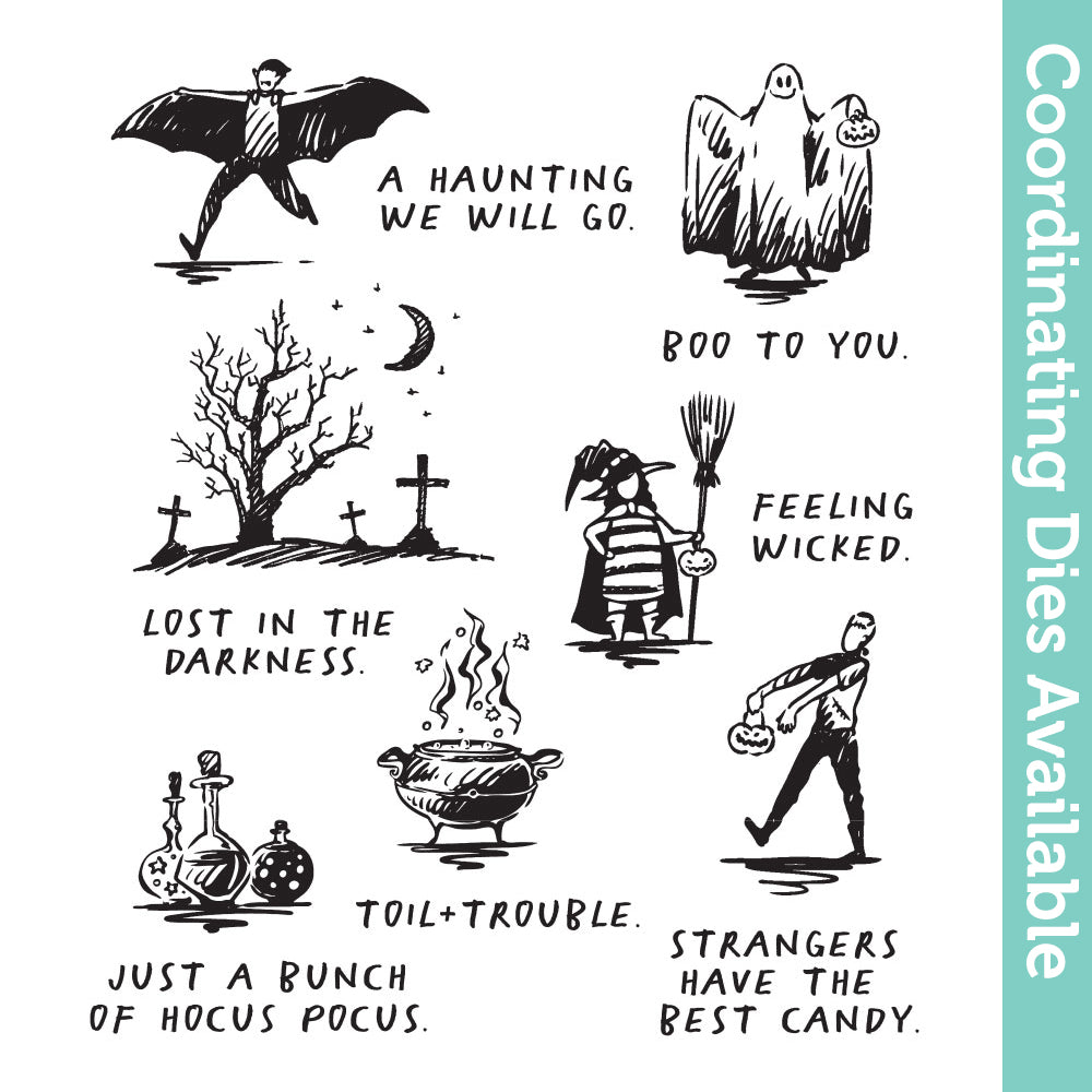 Tim Holtz Cling Rubber Stamps Halloween Sketchbook is a 7 x 8.5 inch set thoughtfully curated by Tim Holtz, featuring 14 deeply etched red rubber cling stamps. Designs include a sketchy vampire, ghost, zombie, witch, graveyard scene, boiling cauldron, and potion bottles, along with 7 spooky sentiments. The stamps are mounted on a 0.125 inch gray static cling cushion for use with Tim Holtz Acrylic Grid Blocks Set 521736 or any standard acrylic blocks, sold separately. Made in the USA by Stampers Anonymous.
