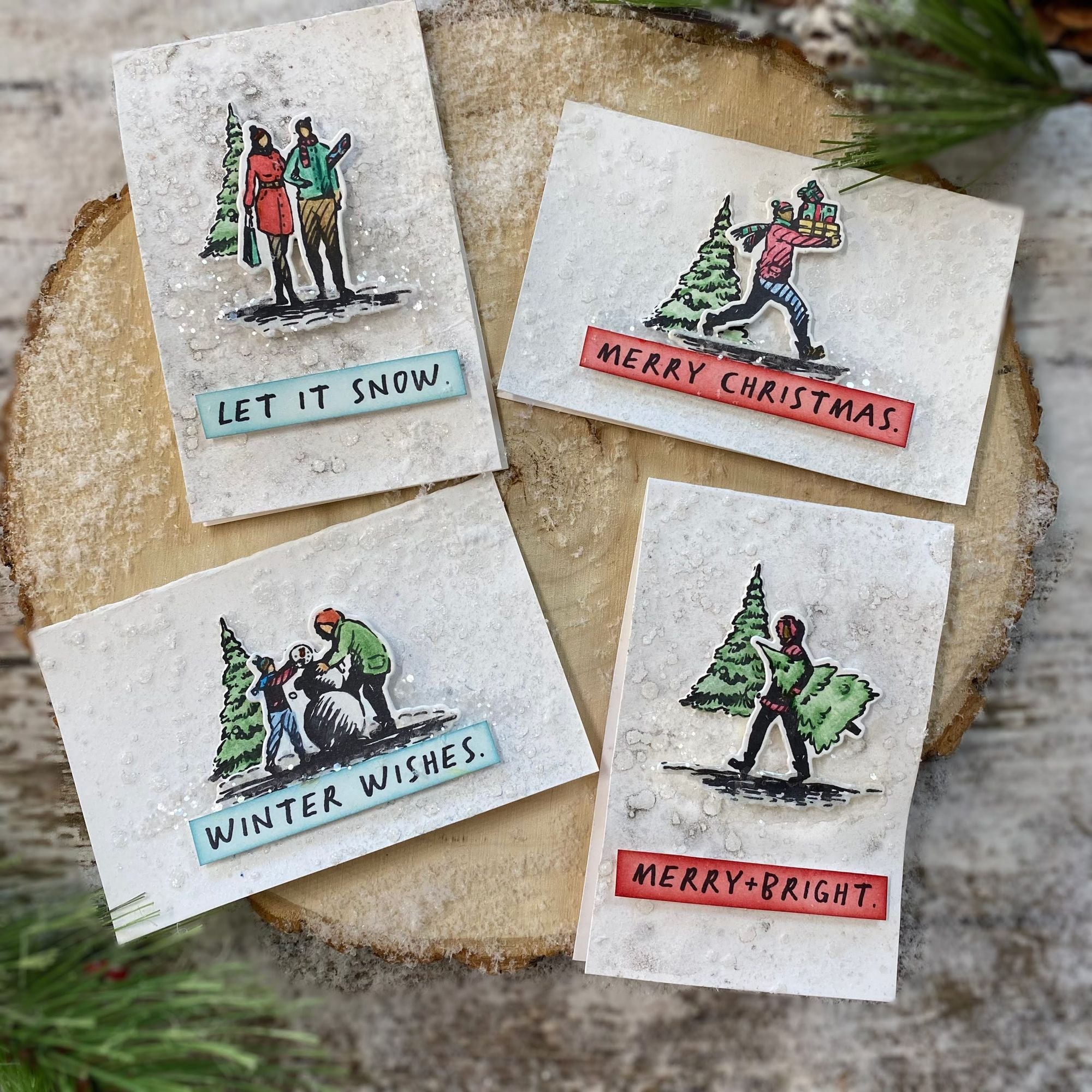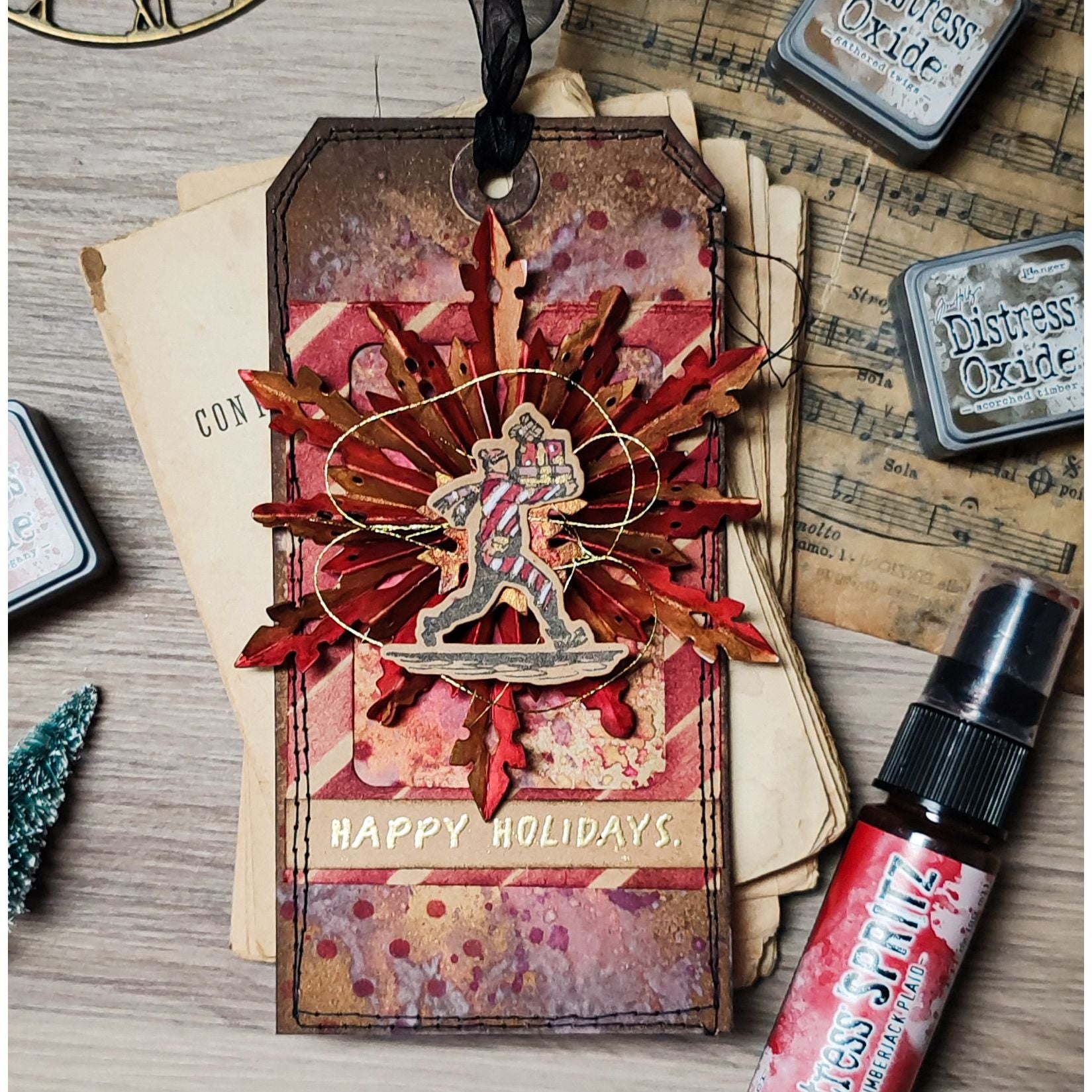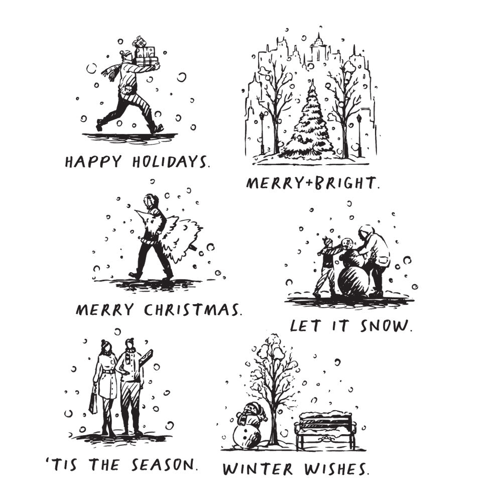 Tim Holtz Cling Rubber Stamps Holiday Sketchbook is a 7 x 8.5 inch set thoughtfully curated by Tim Holtz, featuring 6 deeply etched red rubber cling stamps. The set includes sketchy vintage-style holiday scenes, from carrying a stack of presents to building a snowman, each paired with a coordinating sentiment beneath the image. The stamps are mounted on a 0.125 inch gray static cling cushion for use with Tim Holtz Acrylic Grid Blocks Set 521736 or any standard acrylic blocks, sold separately. Made in the USA by Stampers Anonymous.