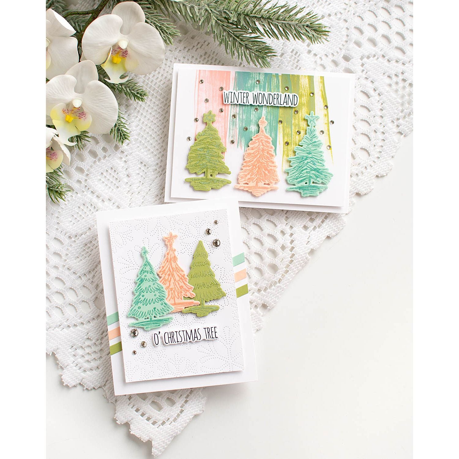 Tim Holtz Cling Rubber Stamps Scribbly Christmas is a 7 x 8.5 inch set thoughtfully curated by Tim Holtz, featuring 20 deeply etched red rubber cling stamps. The set includes 8 unique Christmas tree designs decorated for the season, along with 6 sentiments, each in two different fonts. The stamps are mounted on a 0.125 inch gray static cling cushion for use with Tim Holtz Acrylic Grid Blocks Set 521736 or any standard acrylic blocks, sold separately. Made in the USA by Stampers Anonymous.