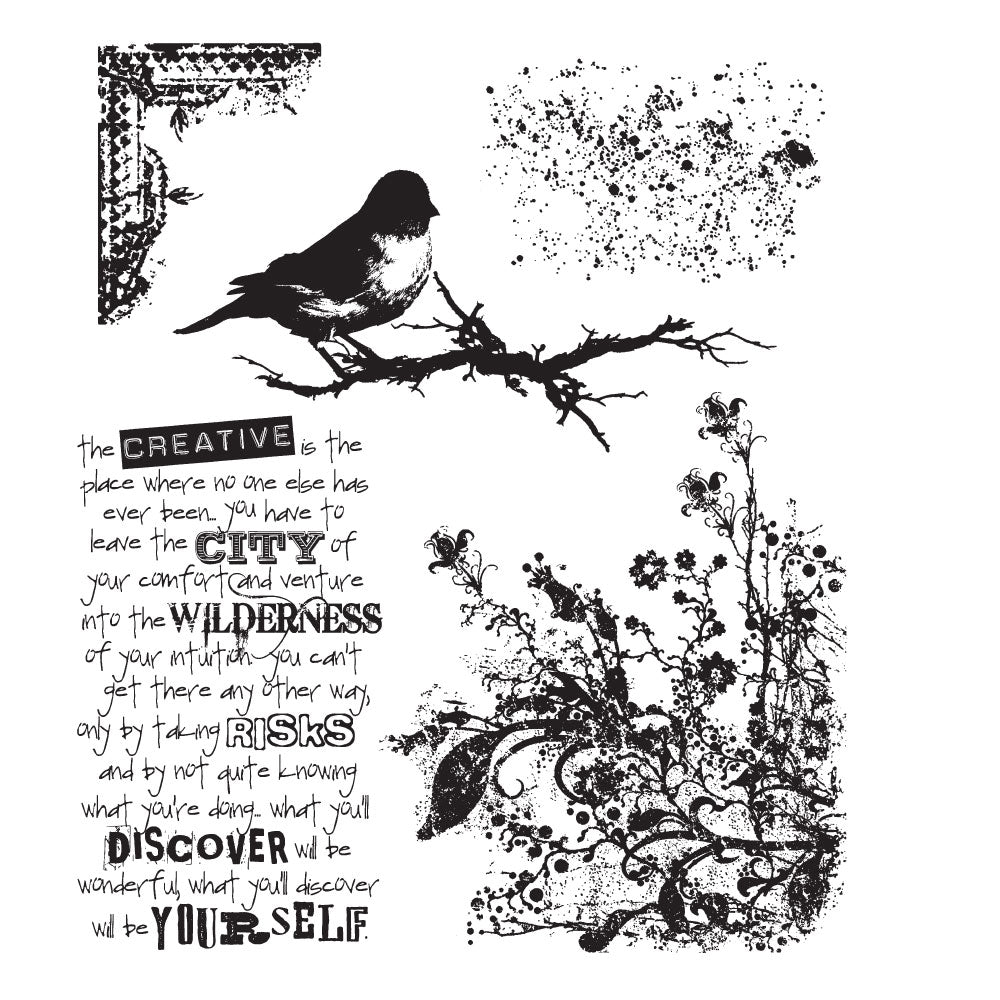 Measuring approximately 7 x 8.5 inches. This set features deeply etched red rubber cling stamps for fine detail. They are mounted on a 0.125-inch gray static cling cushion to be used with clear acrylic blocks, sold separately. Images include a bird on a branch, a floral flourished corner, an ornate framed corner, a splatter texture, and a sentiment.