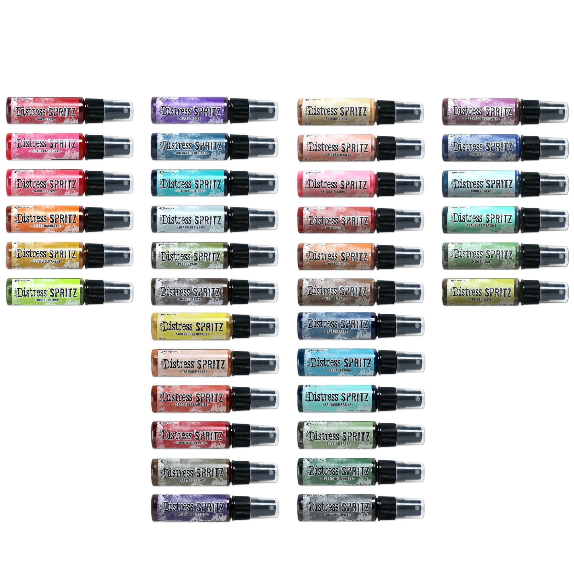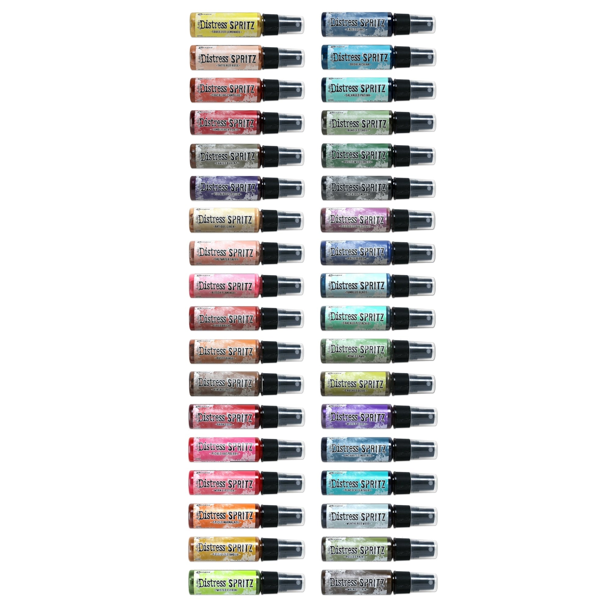 The Distress Spritz Set Of 36 Bundle by Tim Holtz is a collection of shimmer sprays that complement the Distress color palette. These spritzes contain a blend of pearlized pigments in a clear fluid base and are ideal for use on porous surfaces such as paper, canvas, and wood. Use them with various Distress products, such as Ink, Oxide, Spray Stain, Oxide Spray, Paint, Pencils, and Pastes, to create stunning luminous effects and backgrounds. Each bottle contains 1 fl oz (29ml) of product.