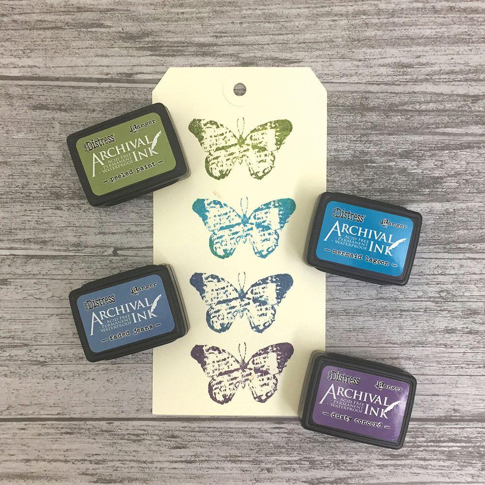 Tim Holtz Distress Mini Archival ink pads are waterproof, acid-free dye inks featuring the classic Distress color palette in the same fade resistant formula used in Ranger Archival Ink. This kit includes four approximately 1.25 x 1.75 inch sized ink pads in the following colors: Peeled Paint, Mermaid Lagoon, Faded Jeans, and Dusty Concord.
