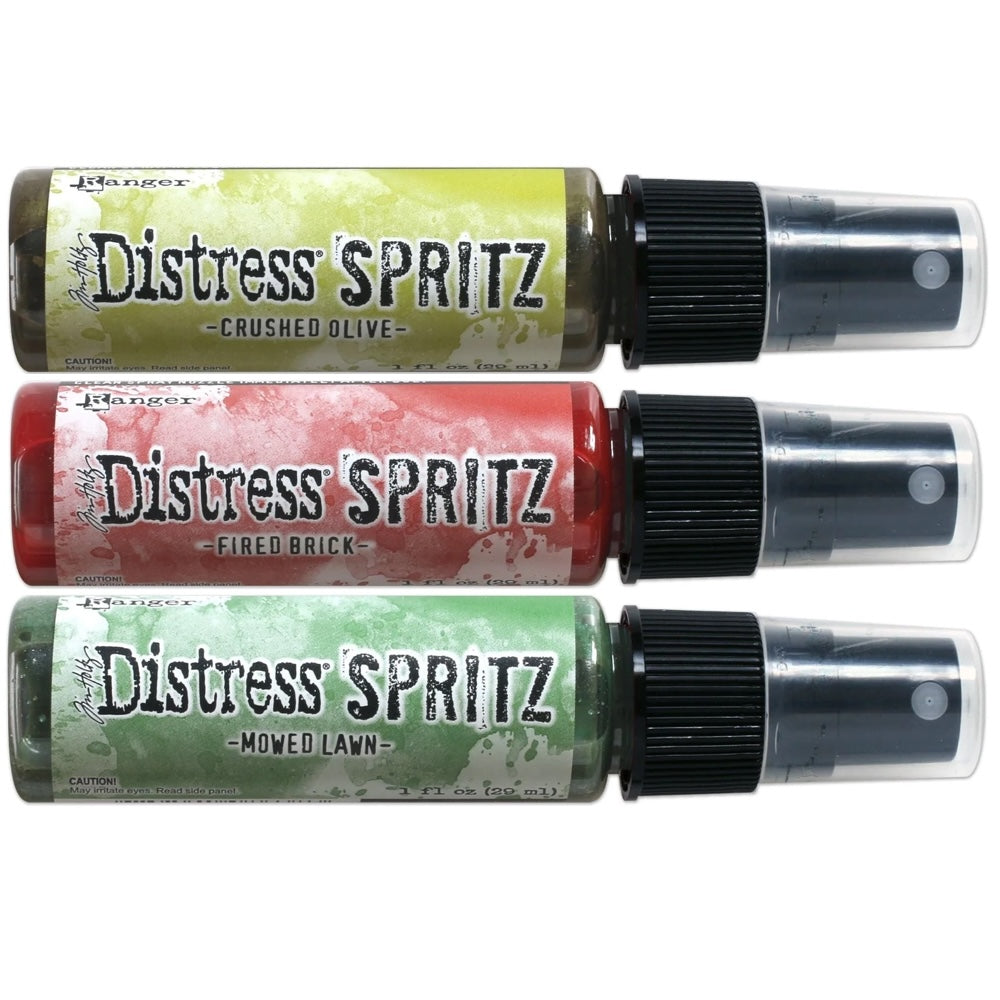 Tim Holtz Distress Spritz: a shimmering spray that perfectly complements the Distress color palette. This luminous formula is made with pearlized pigments in a clear fluid base, ideal for porous surfaces like paper, canvas, and wood. Add a touch of colorful shimmer to your favorite Distress products, including Ink, Oxide, Spray Stain, Oxide Spray, Paint, Pencils, and Pastes. Included are three 1 fl oz bottles (29ml).