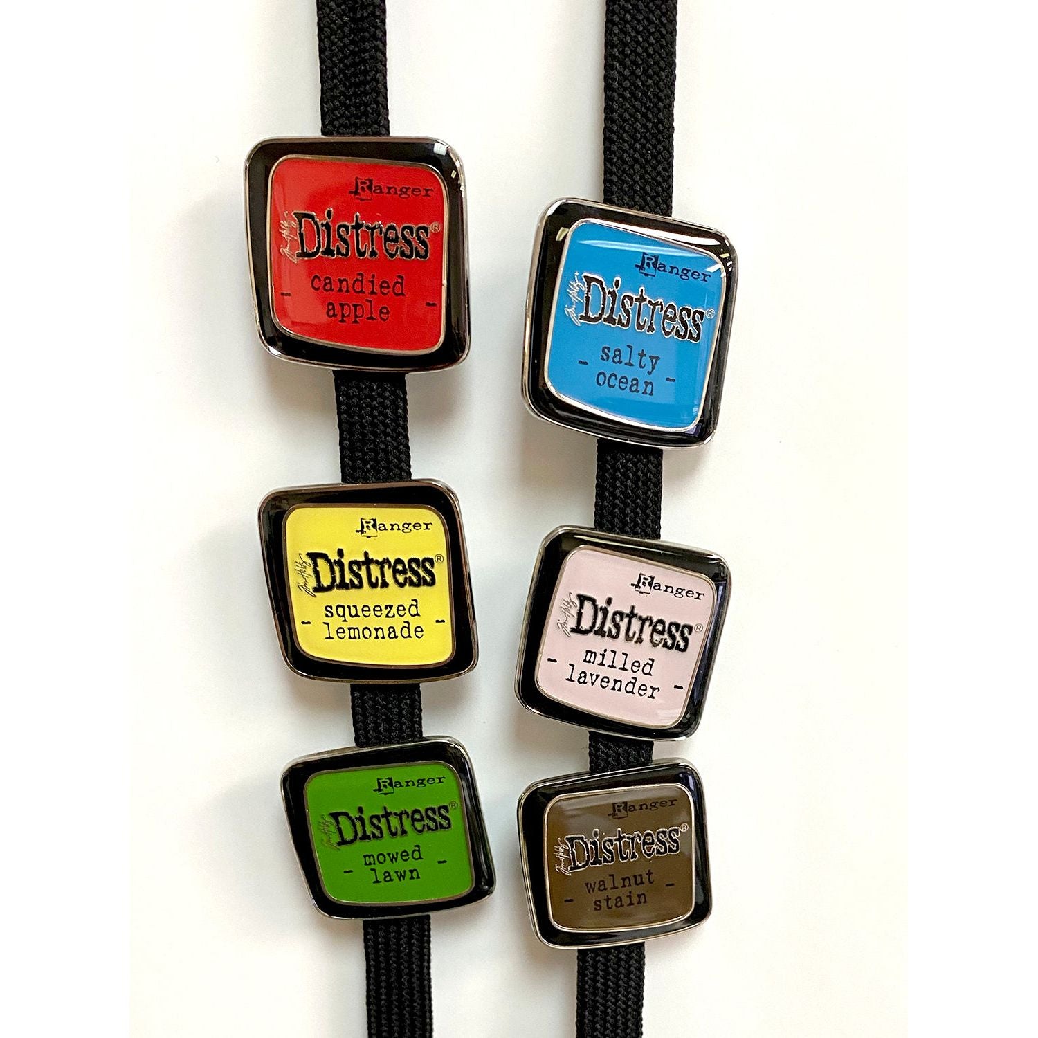 The iconic Tim Holtz Distress Ink Pads are now available in collectable mini Enamel Pins! Distress Enamels Pins are inspired by the styling of the original ink pads, with a graphic flair. These custom pins are created in your favorite colors of Distress, engraved in silver metallic and layered with a smooth, shiny finish. Distress Set 5 includes: Candied Apple, Salty Ocean, Squeezed Lemonade, Milled Lavender, Mowed Lawn, Walnut Stain.