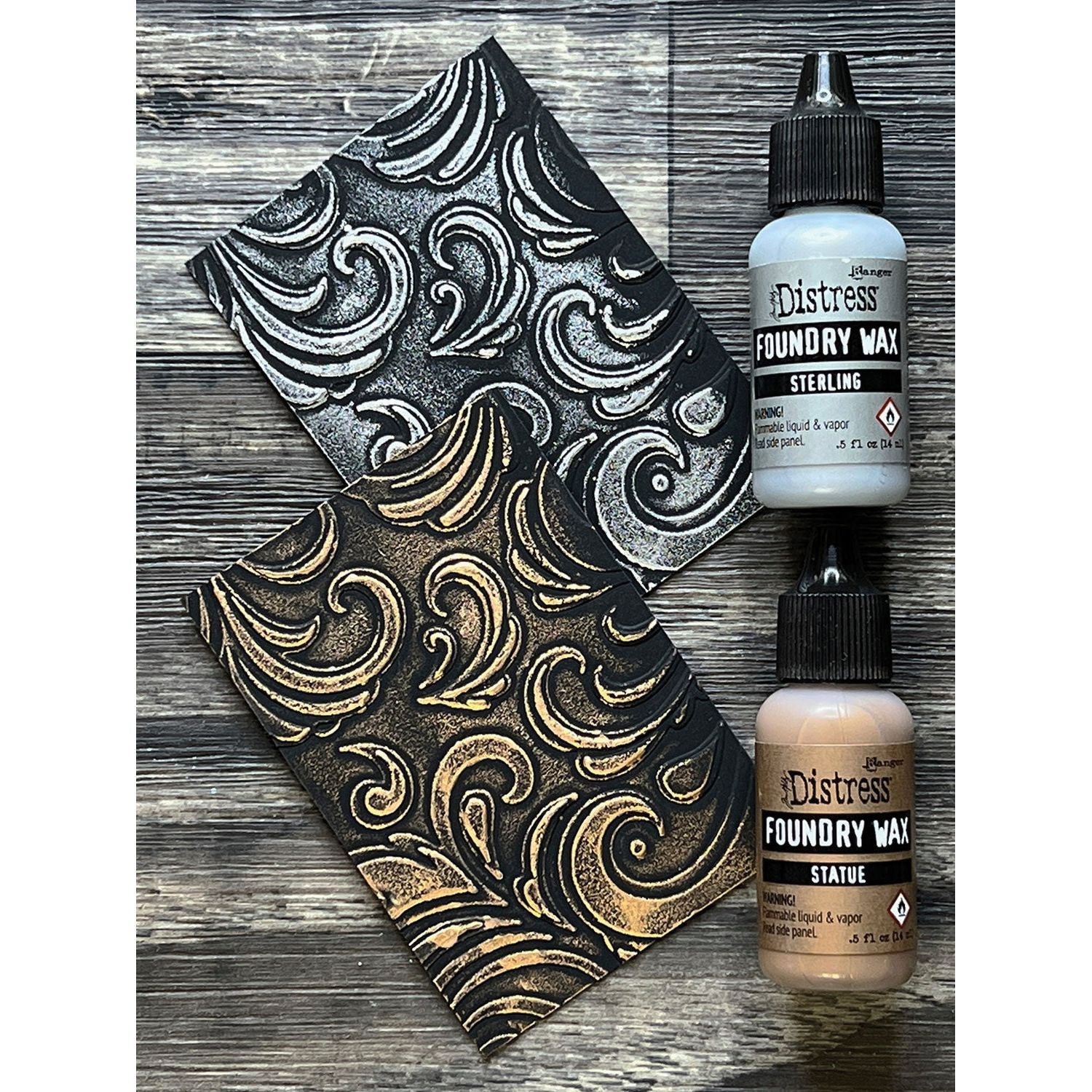 Tim Holtz Distress Foundry Wax Kit 2 contains 1 bottle each Sterling and Statue in .5 fl oz bottles.