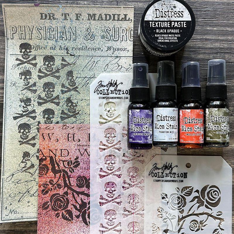 Tim Holtz Distress Halloween Mica Stains Set 6 provides craft enthusiasts with a luminous way to add shimmer to paper crafts and mixed media projects. The set contains three 1 fl oz bottles in colors of Phantom Mist, Specimen and Ominous Twilight. Mica Stains adhere to paper, canvas, wood, fabric and other porous surfaces. Blend with Distress Ink, Oxide, Spray Stain and Oxide Spray for colorful effects.