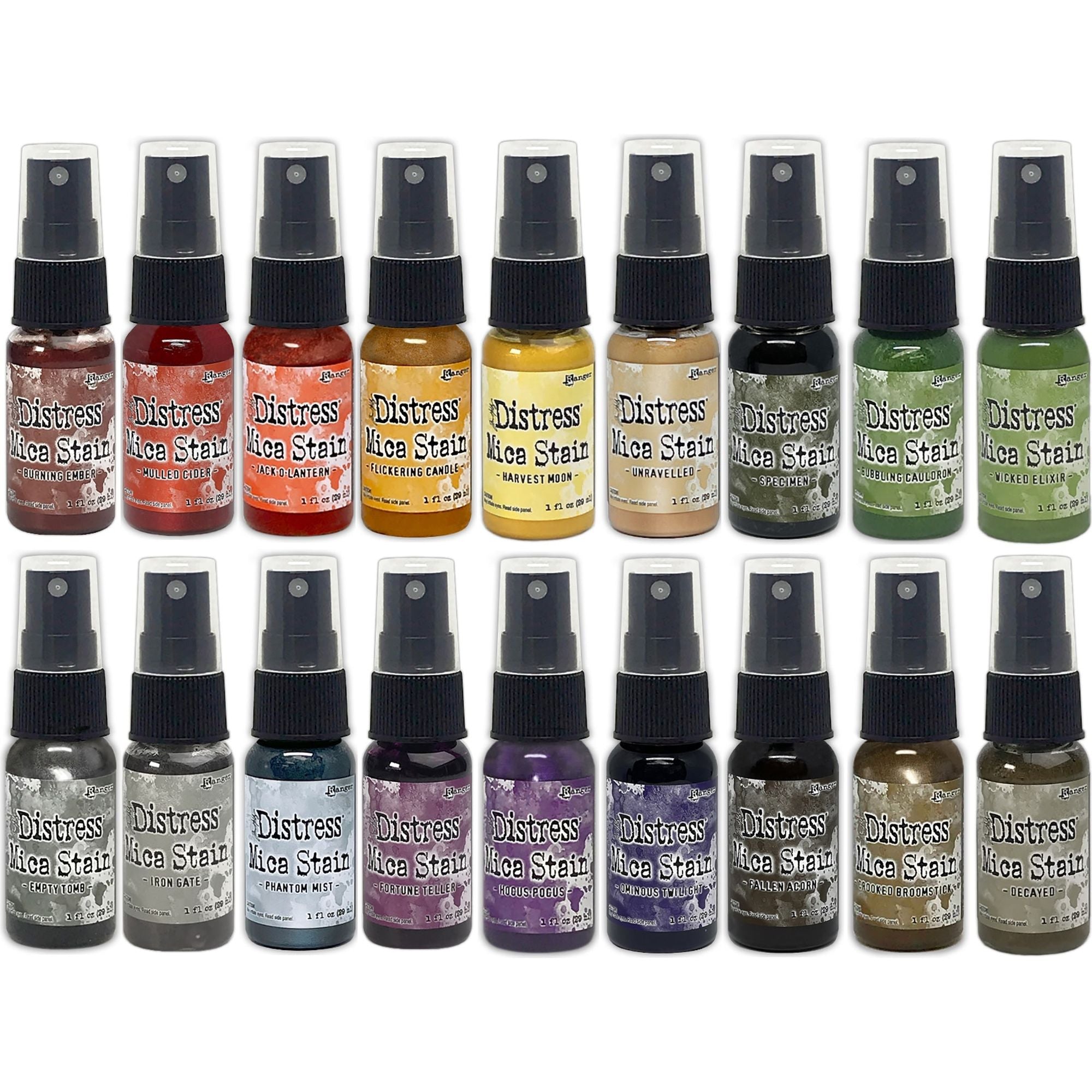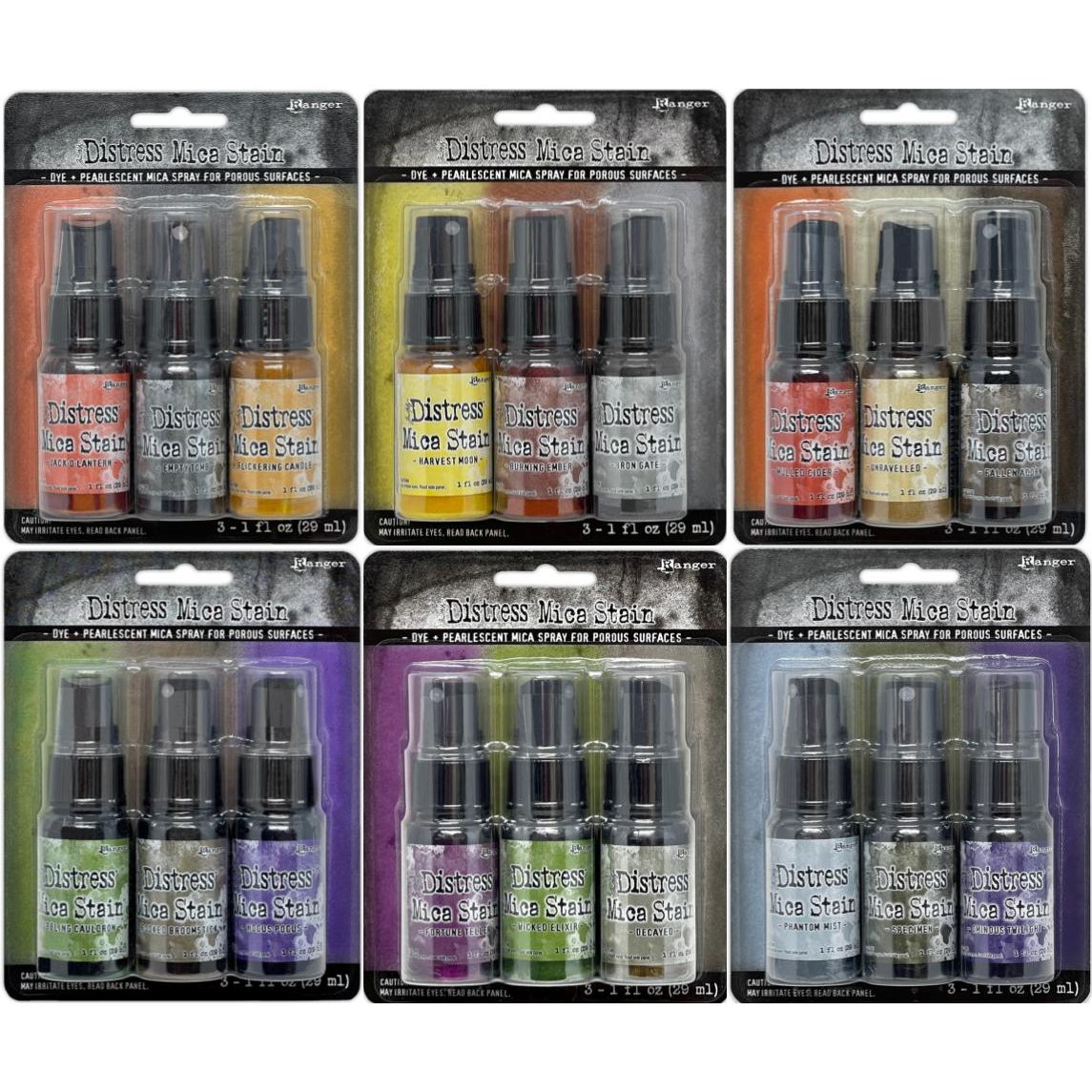 Tim Holtz Distress Mica Stains provide an eye-catching, iridescent shimmer for mixed media and paper craft projects. These translucent pearlescent sprays impart a luminous effect on paper, canvas, wood, fabric, and other porous surfaces. With the bundle of six sets, each containing three 1oz. bottles, a total of 18 bottles can be used.