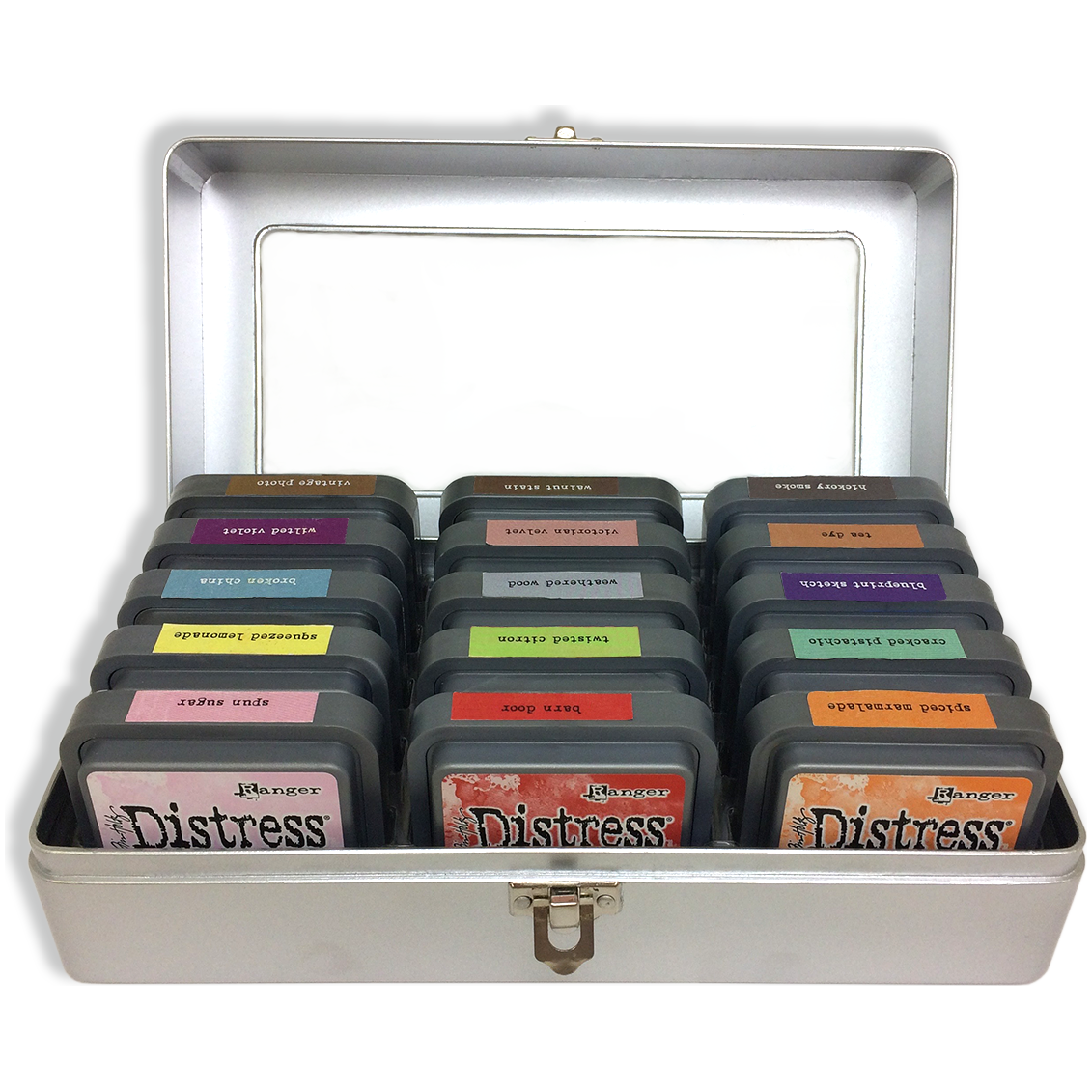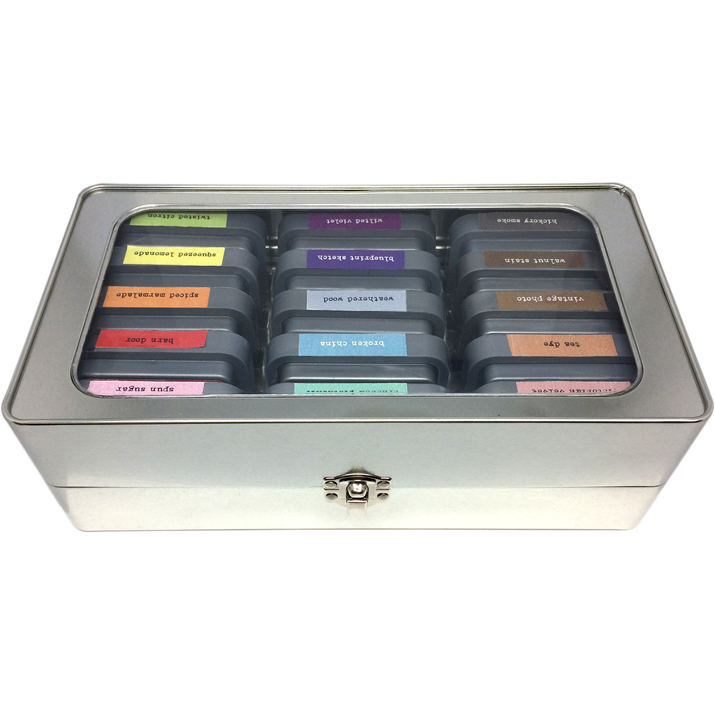 Tim Holtz Distress Ink Pad Storage Tin is the ideal storage solution for Tim Holtz Distress Ink Pads and Distress Oxide Ink Pads. Organize and transport Distress Ink Pads easily in this convenient tin. Features a clear window and hinged metal closure. This convenient, portable storage holds 15 - 3 x 3 inch Distress Ink or Oxide Ink Pads. Overall tin is approximately 10 inches L x 5.125 inches D x 3.5 inches H.