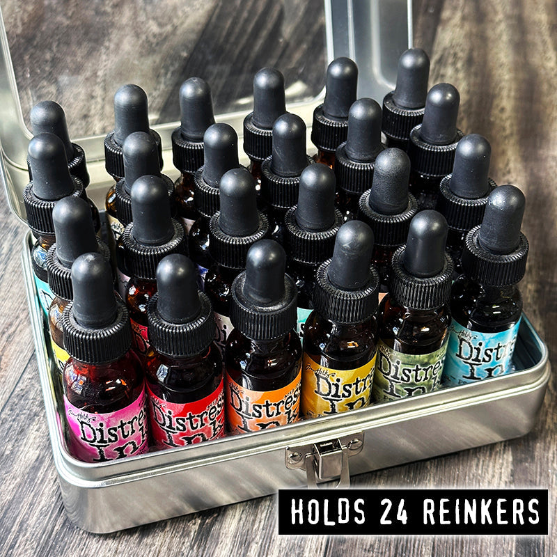 Inside the tin, you'll find interchangeable inserts that make it easy to organize and access individual bottles. These inserts can hold up to 24 Distress Reinkers, 20 Distress Paints, or 20 Distress Mini Sprays. The inserts are divided, ensuring that your supplies stay neatly organized and don't mix together.
