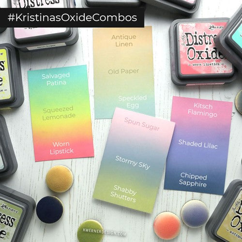 Distress Oxide Ink Pads are a water-reactive dye and pigment ink fusion that creates an oxidized effect when sprayed with water. Use with stamps, stencils, and direct to surface. Blend using Ink Blending Tools and Foam. All oxide colors are available in 3 x 3 inch ink pads and coordinating .5 oz re-inkers.