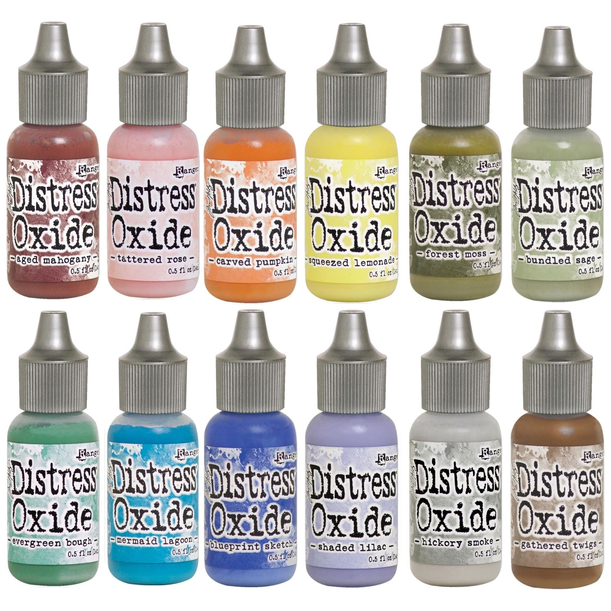 Distress Oxide Reinkers are a water-reactive dye and pigment ink fusion that creates an oxidized effect when sprayed with water. Use with stamps, stencils, and direct to surface. All oxide colors are available in 3 x 3 inch ink pads and coordinating .5 oz re-inkers.