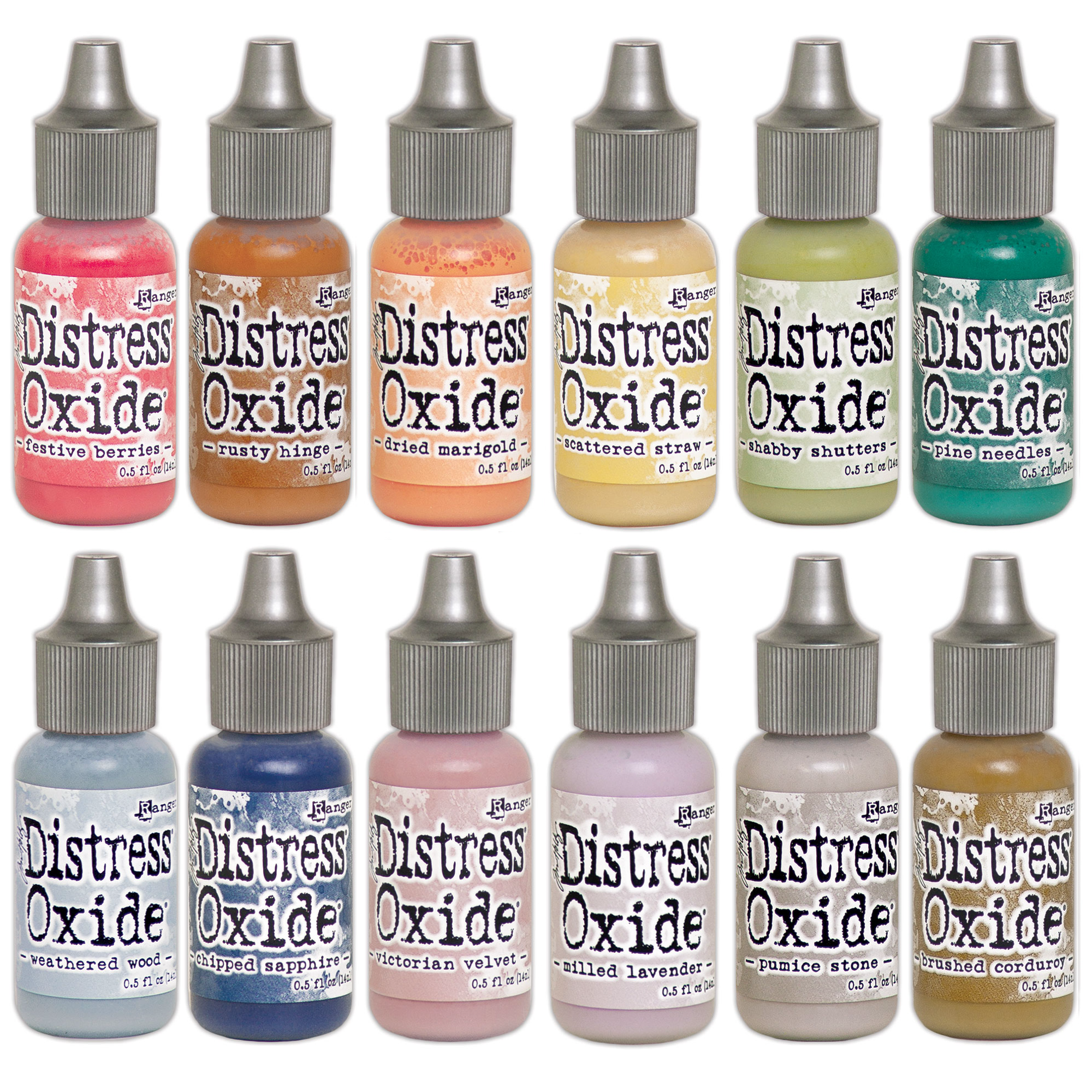 Distress Oxide Reinkers are a water-reactive dye and pigment ink fusion that creates an oxidized effect when sprayed with water. Use with stamps, stencils, and direct to surface. All oxide colors are available in 3 x 3 inch ink pads and coordinating .5 oz re-inkers.