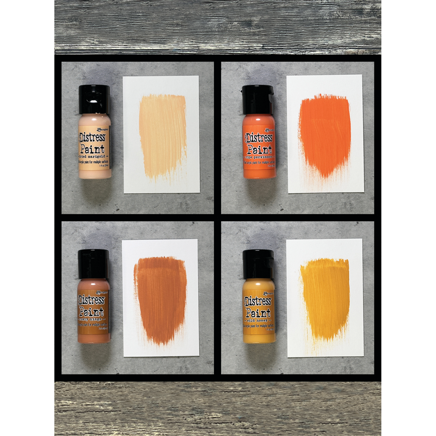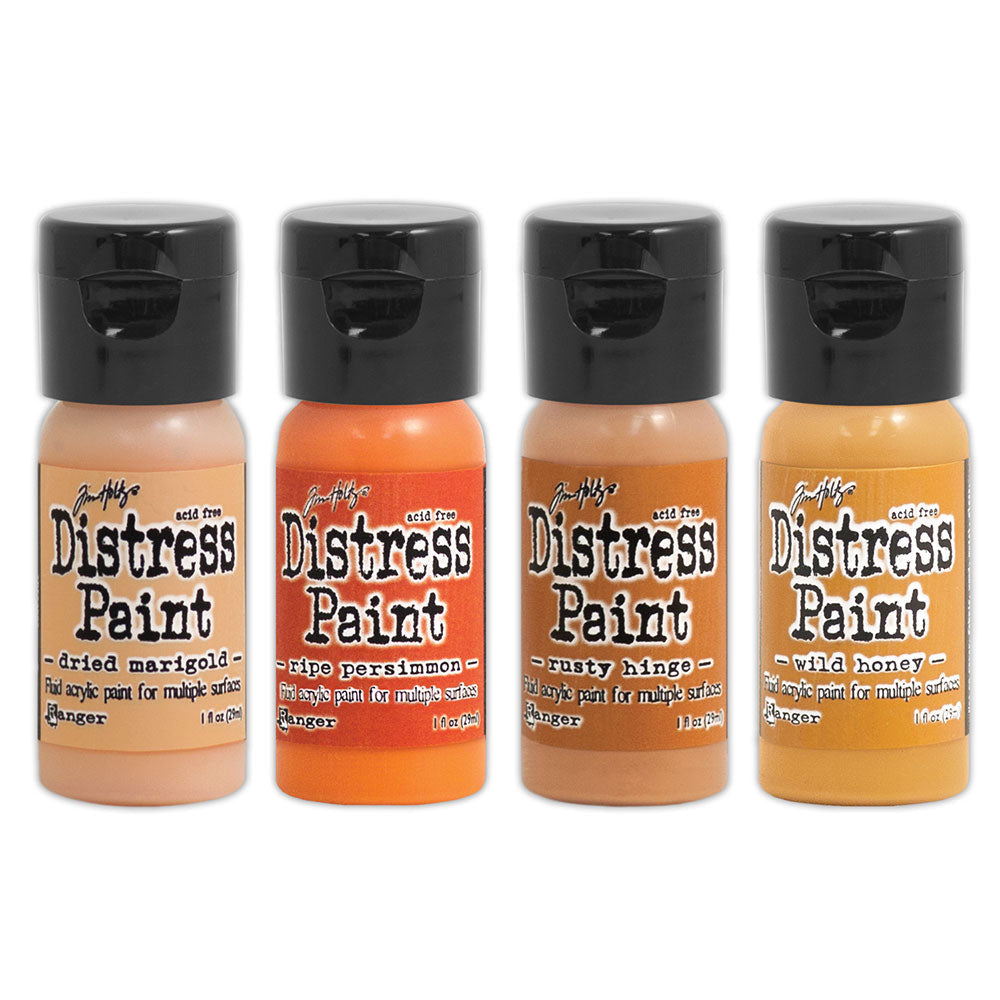 The Tim Holtz Distress Flip Cap Paint Assortment 2 by Ranger is a must-have for any art enthusiast! This kit includes four vibrant colors: Dried Marigold, Ripe Persimmon, Rusty Hinge and Wild Honey. The convenient flip tops allow for quick and easy application of the Distress Paints with brushes, blending tools, splatter brushes, and more.