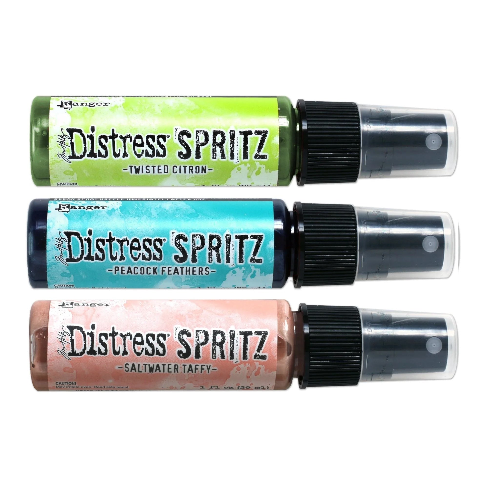 Introducing Tim Holtz Distress Spritz: a shimmering spray that perfectly complements the Distress color palette. This luminous formula is made with pearlized pigments in a clear fluid base, ideal for porous surfaces like paper, canvas, and wood. Add a touch of colorful shimmer to your favorite Distress products, including Ink, Oxide, Spray Stain, Oxide Spray, Paint, Pencils, and Pastes. Included are three 1 fl oz bottles (29ml).